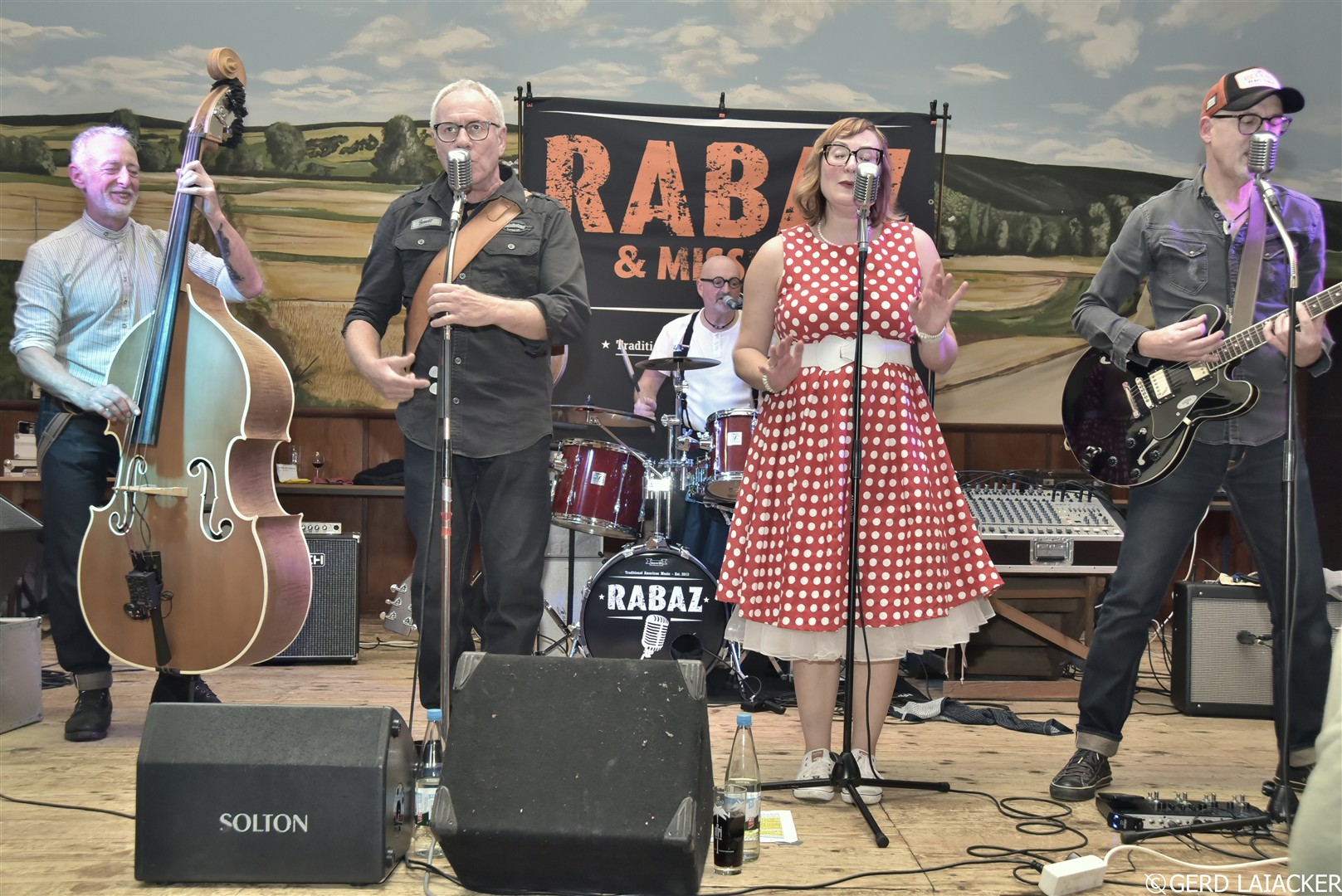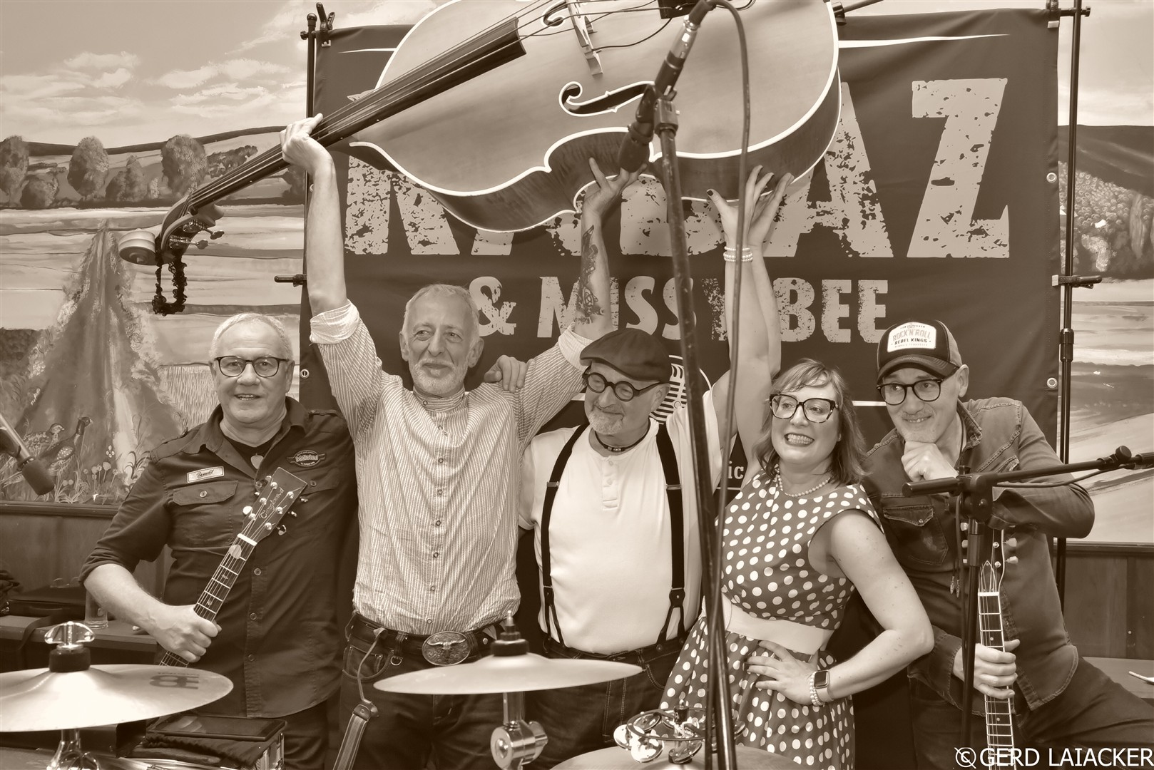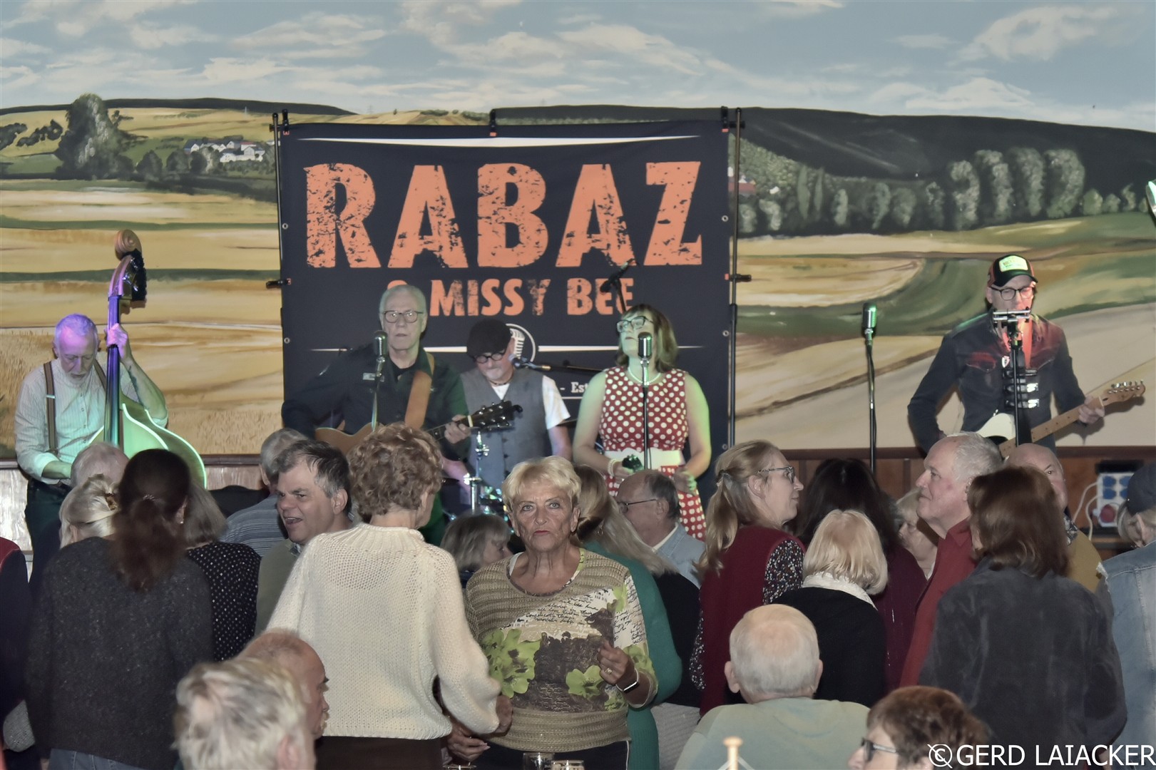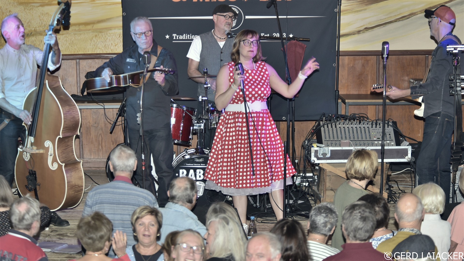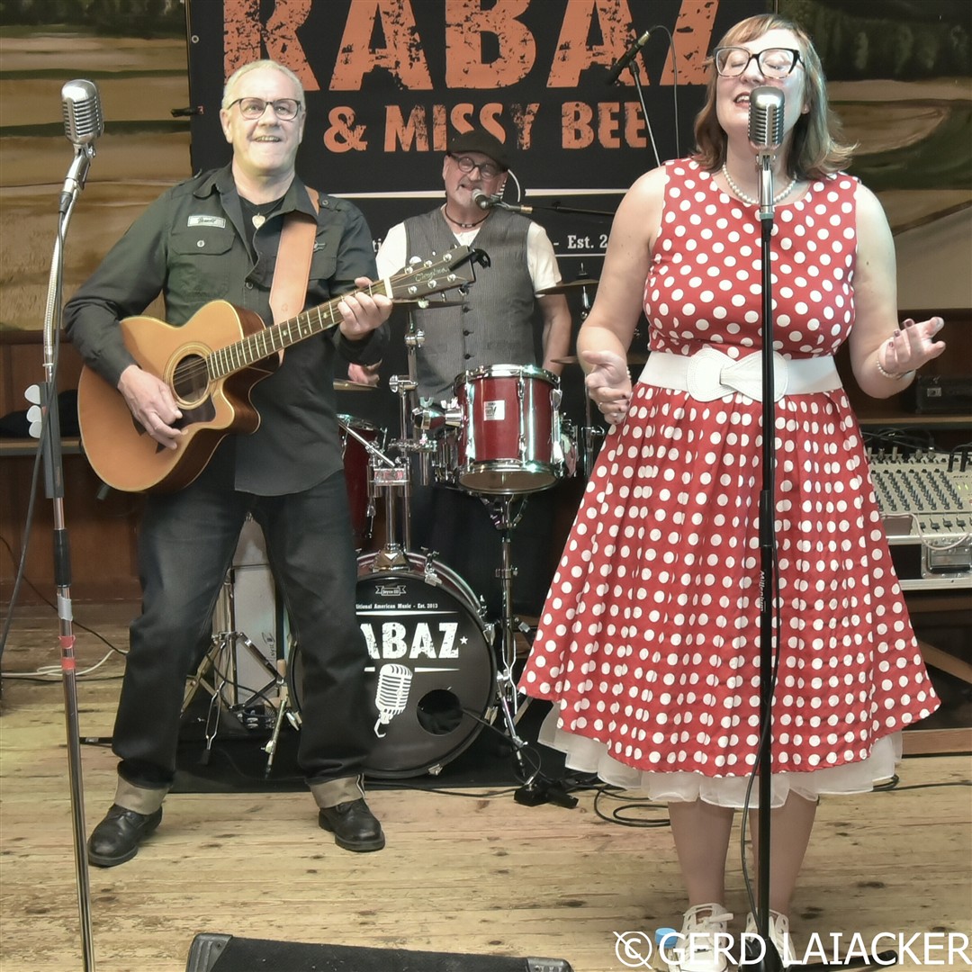 Nachdem Moni die Gäste herzlich begrüßte und einen schwungvollen Abend versprach, füllte sich die Tanzfläche schon bei den ersten Songs „Good Rocking Tonight“ von Roy Brown und „Get Rhythm“ von Johnny Cash. Die Spielfreude und Leidenschaft der Musiker waren deutlich spürbar und übertrugen sich sofort auf das Publikum, die begeistert mitsangen und mittanzten. Missy Bee überzeugte nicht nur mit ihrer Stimme, sondern auch mit ihrem stilechten Outfit im 50er-Jahre-Look, das perfekt zum Repertoire passte. Gemeinsam mit Ralf Schneider an Vocals, Harmonica, Guitar und Mandolin, Achim Karn am Kontrabass, Manfred Bürner an Vocals und Guitar sowie Joachim Kreher an Vocals, Drums und Percussion bot die Band ein harmonisches Zusammenspiel, das vom Publikum mit großem Applaus gefeiert wurde.