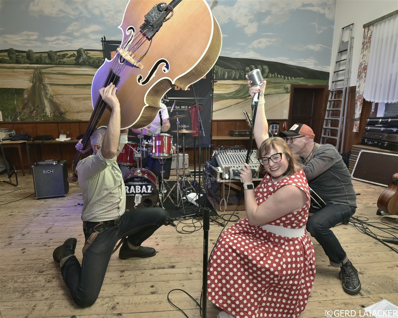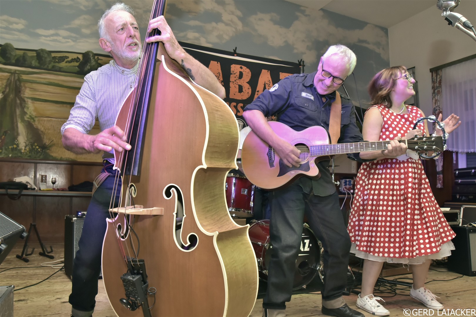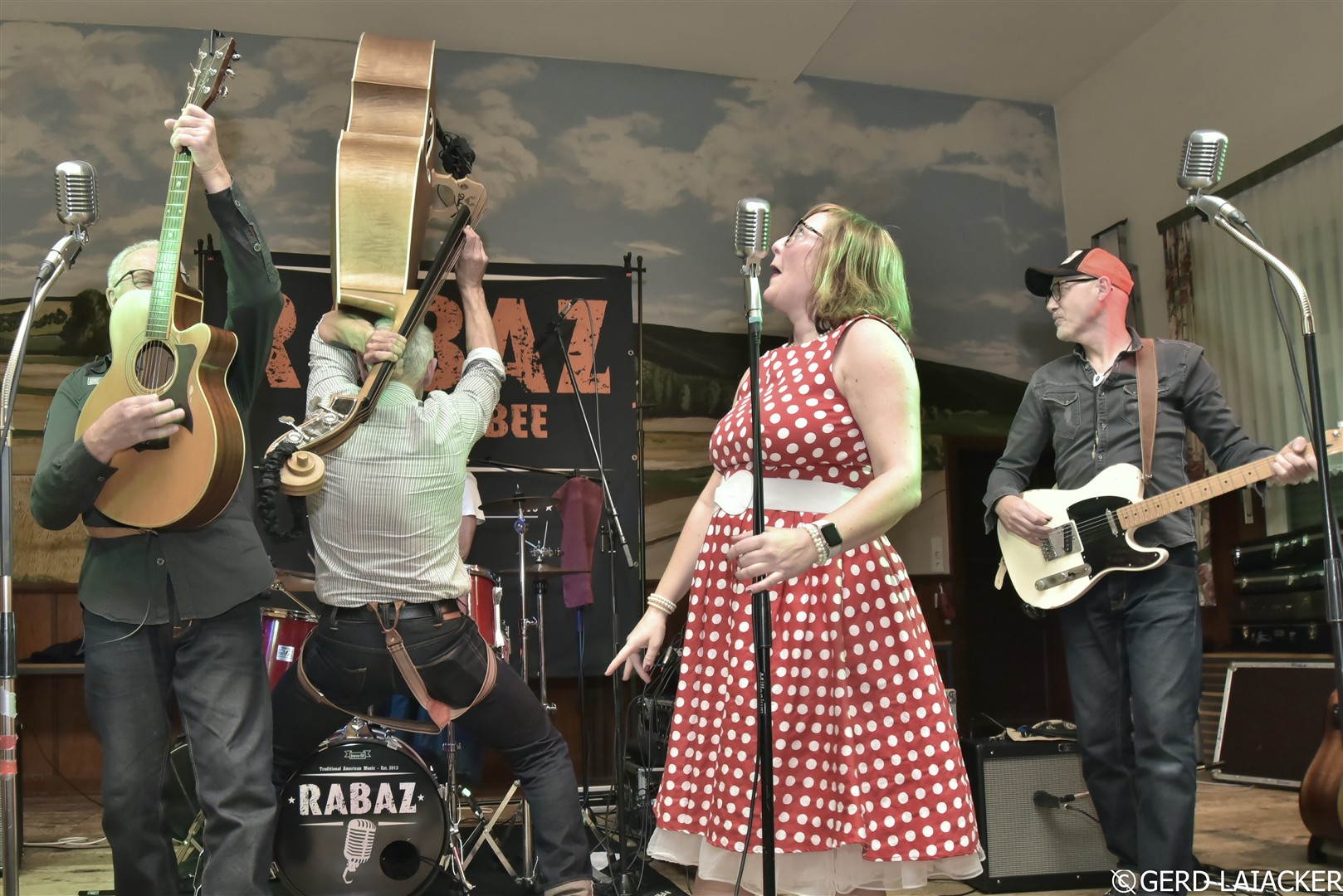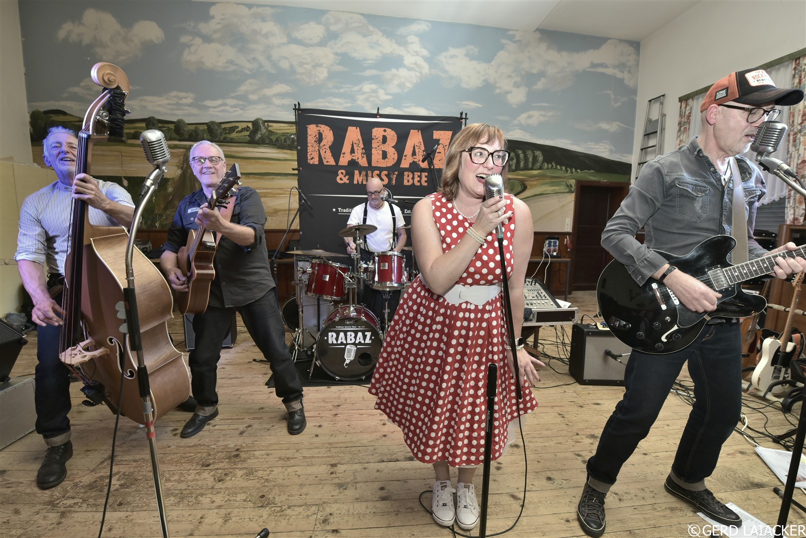 Nachdem Moni die Gäste herzlich begrüßte und einen schwungvollen Abend versprach, füllte sich die Tanzfläche schon bei den ersten Songs „Good Rocking Tonight“ von Roy Brown und „Get Rhythm“ von Johnny Cash. Die Spielfreude und Leidenschaft der Musiker waren deutlich spürbar und übertrugen sich sofort auf das Publikum, die begeistert mitsangen und mittanzten. Missy Bee überzeugte nicht nur mit ihrer Stimme, sondern auch mit ihrem stilechten Outfit im 50er-Jahre-Look, das perfekt zum Repertoire passte. Gemeinsam mit Ralf Schneider an Vocals, Harmonica, Guitar und Mandolin, Achim Karn am Kontrabass, Manfred Bürner an Vocals und Guitar sowie Joachim Kreher an Vocals, Drums und Percussion bot die Band ein harmonisches Zusammenspiel, das vom Publikum mit großem Applaus gefeiert wurde.