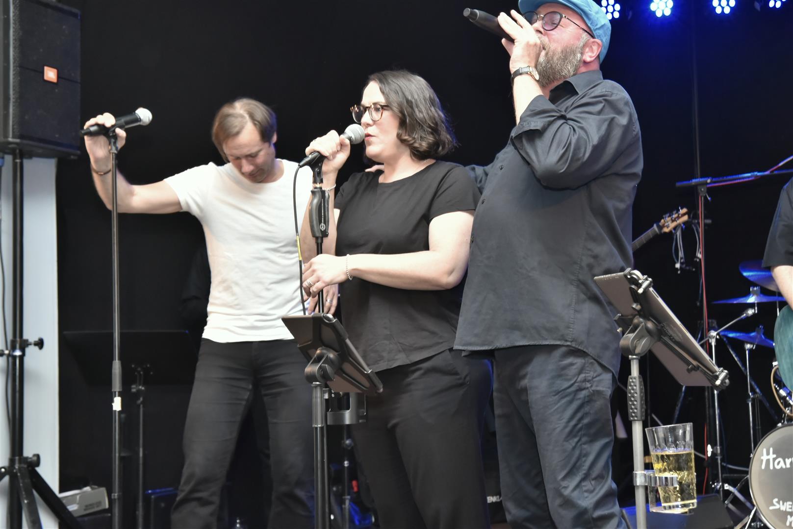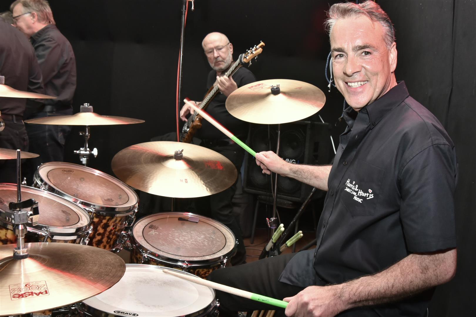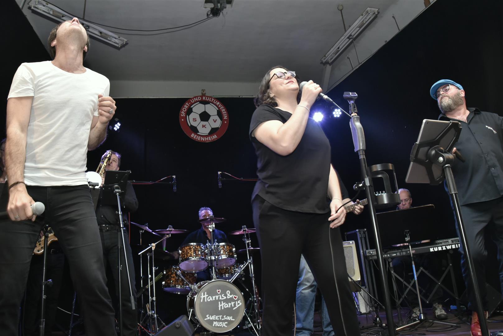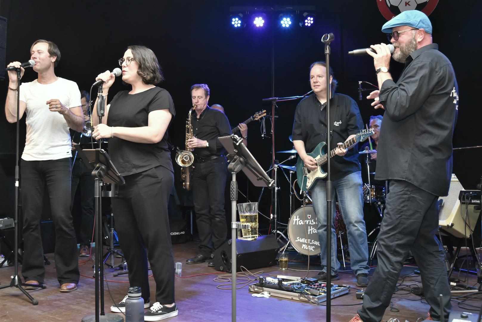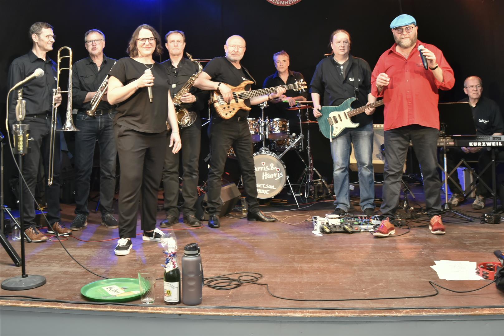 Joe Cockers "Unchaine my heart" performte Andreas mit Bravour. Stefan an der Gitarre, Peter am Schlagzeug, Thomas am Keyboard, Reiner am Bass und Dirk am Saxophon machen die Band "Harris & Harris" komplett.