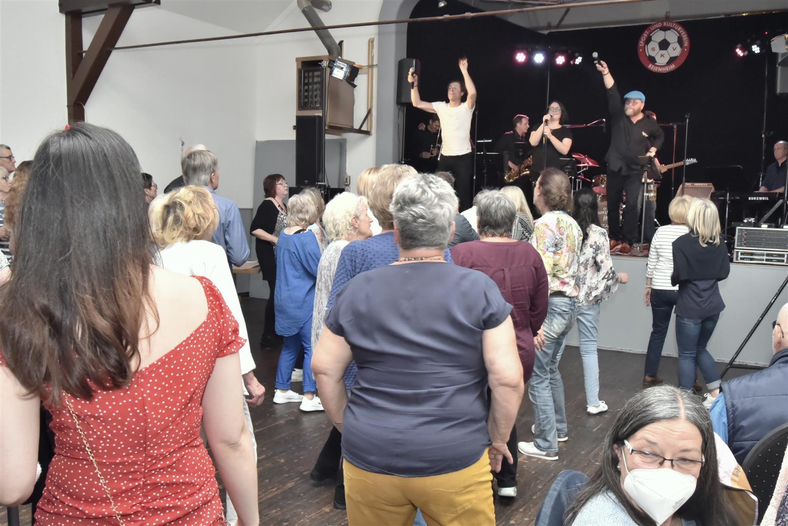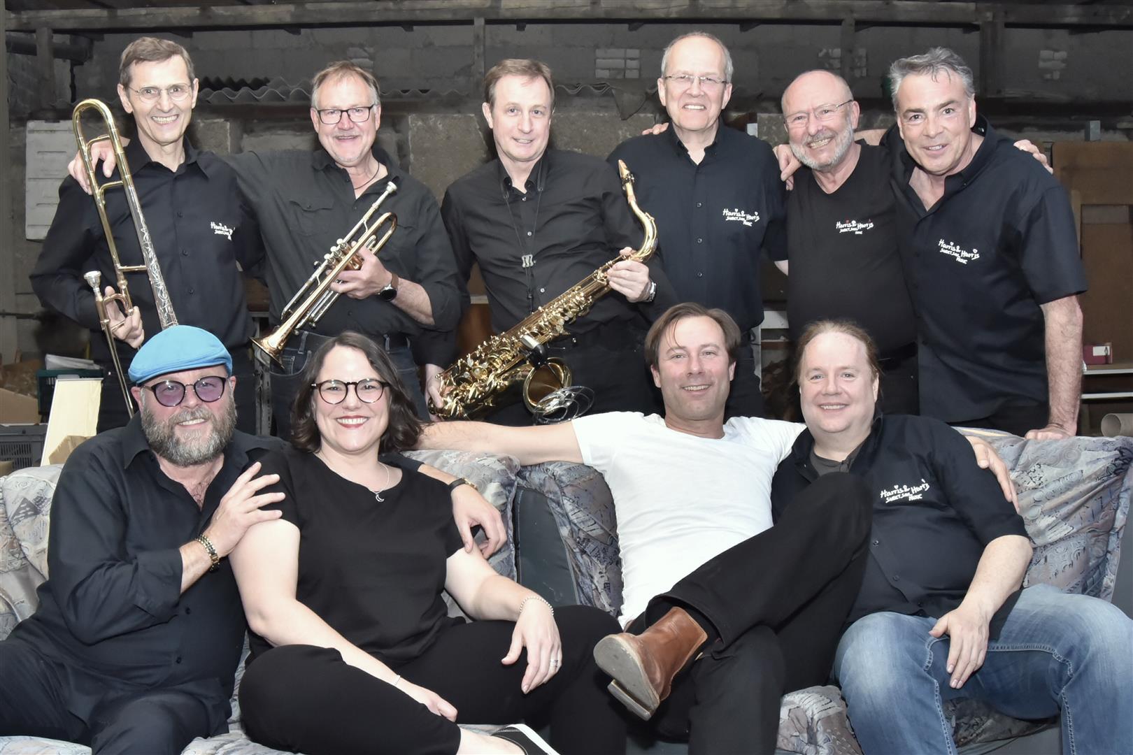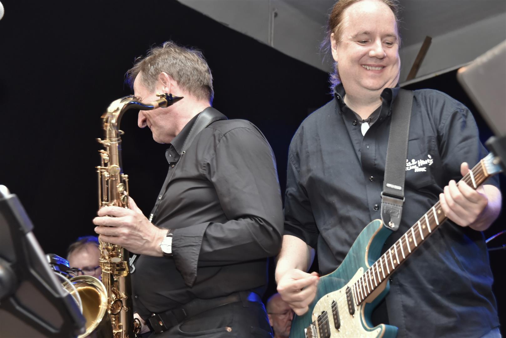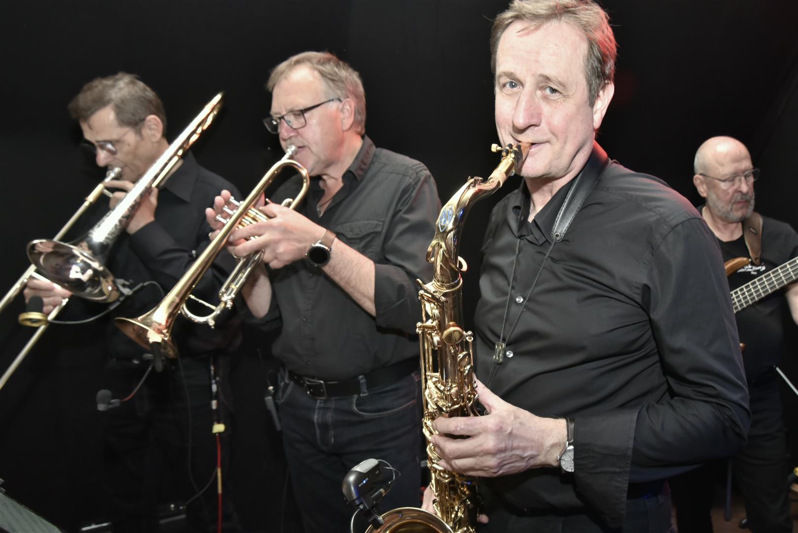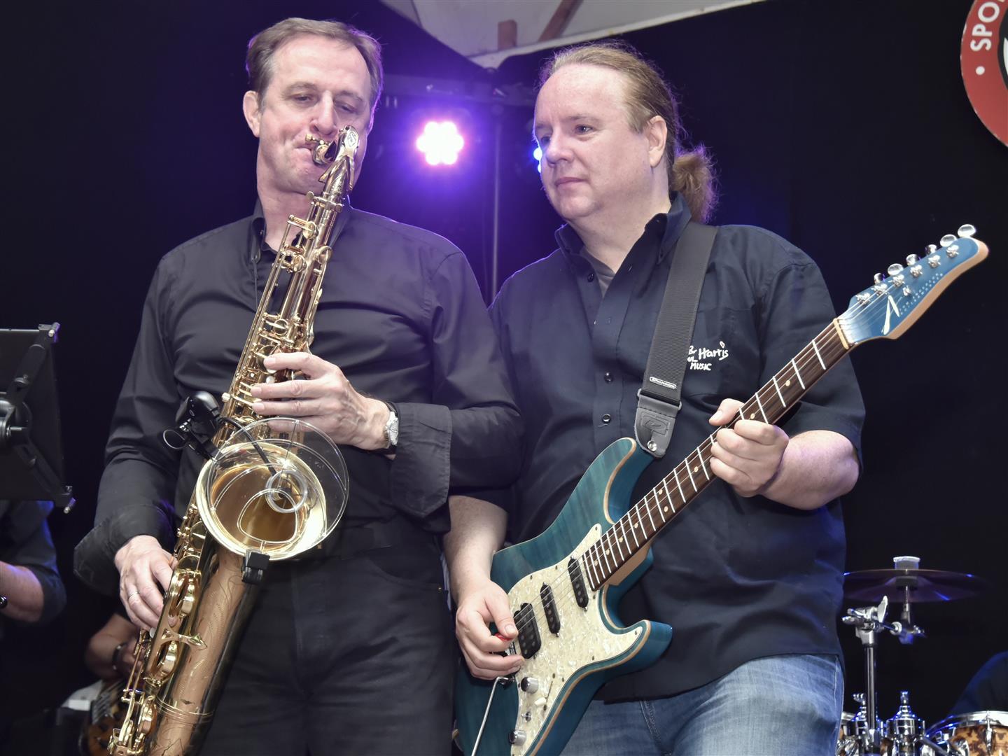 Joe Cockers "Unchaine my heart" performte Andreas mit Bravour. Stefan an der Gitarre, Peter am Schlagzeug, Thomas am Keyboard, Reiner am Bass und Dirk am Saxophon machen die Band "Harris & Harris" komplett.