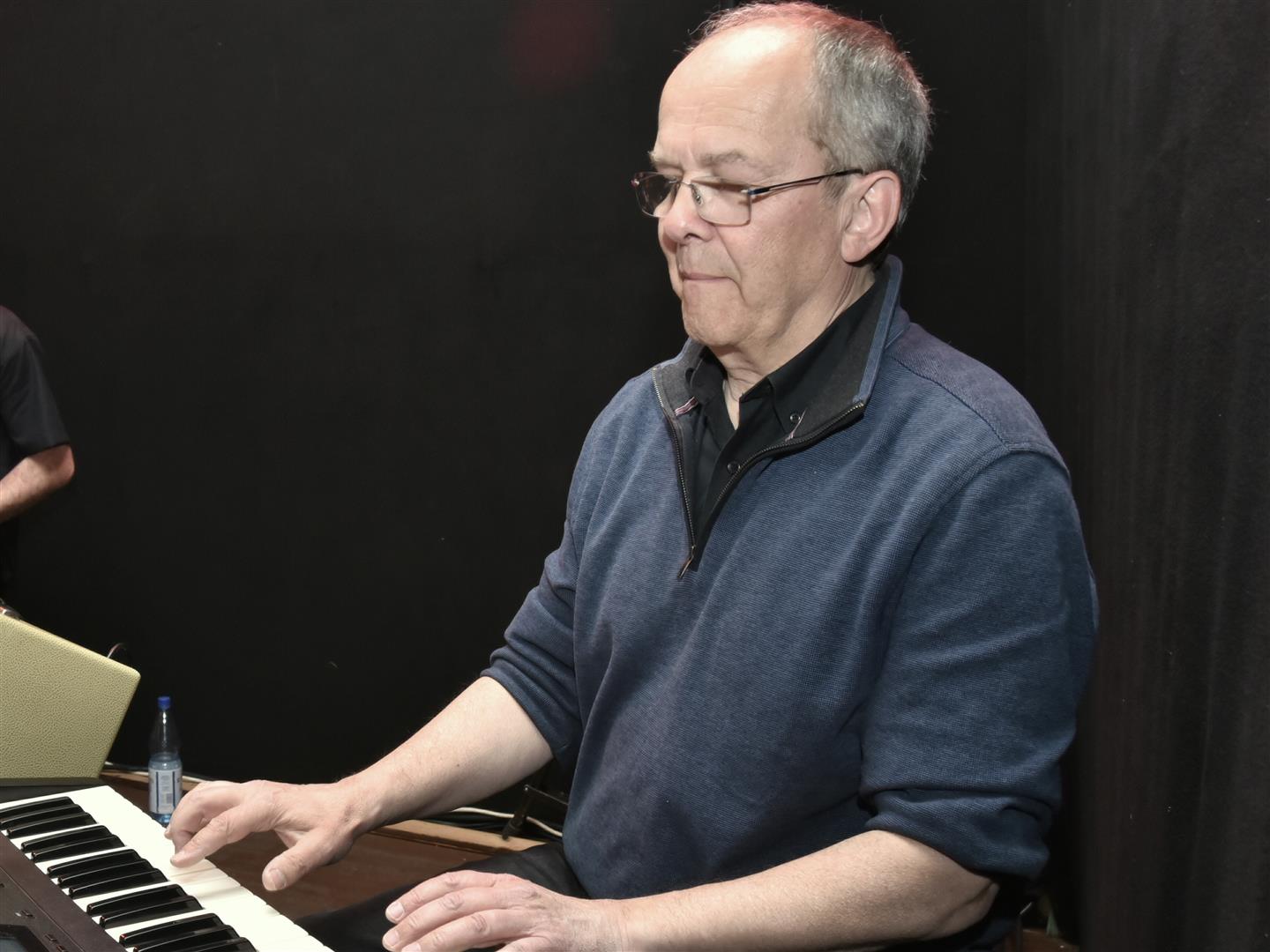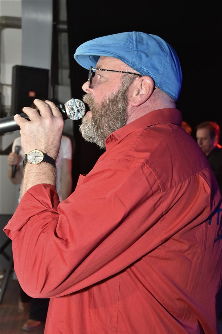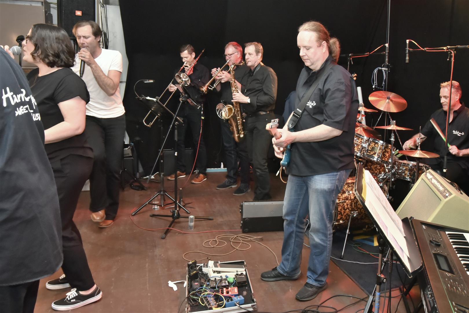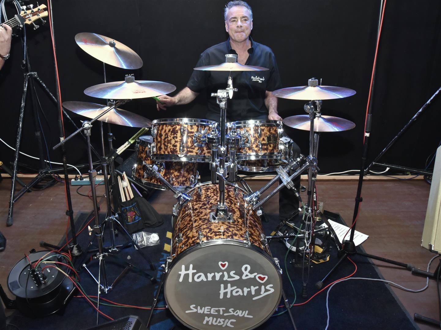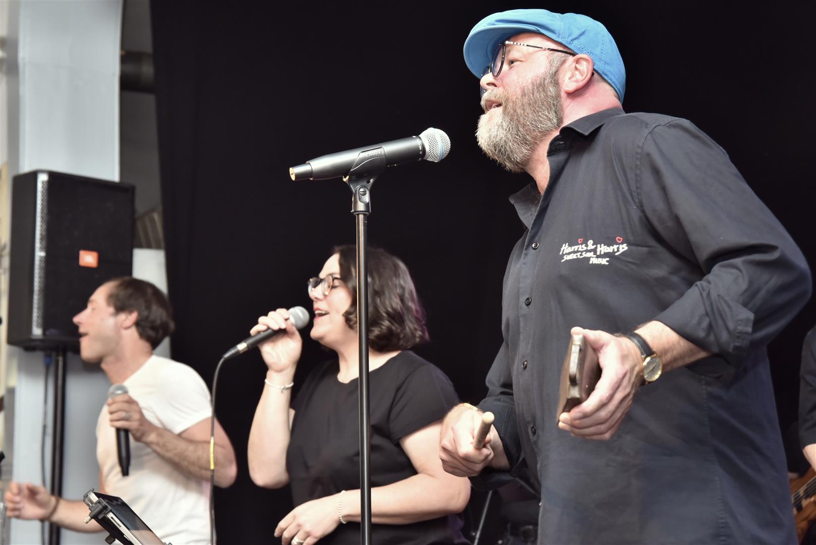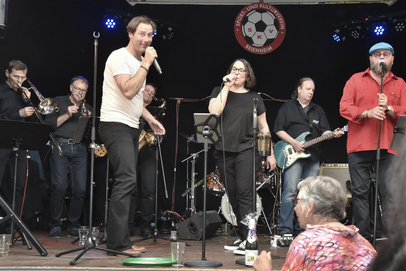 Joe Cockers "Unchaine my heart" performte Andreas mit Bravour. Stefan an der Gitarre, Peter am Schlagzeug, Thomas am Keyboard, Reiner am Bass und Dirk am Saxophon machen die Band "Harris & Harris" komplett.
