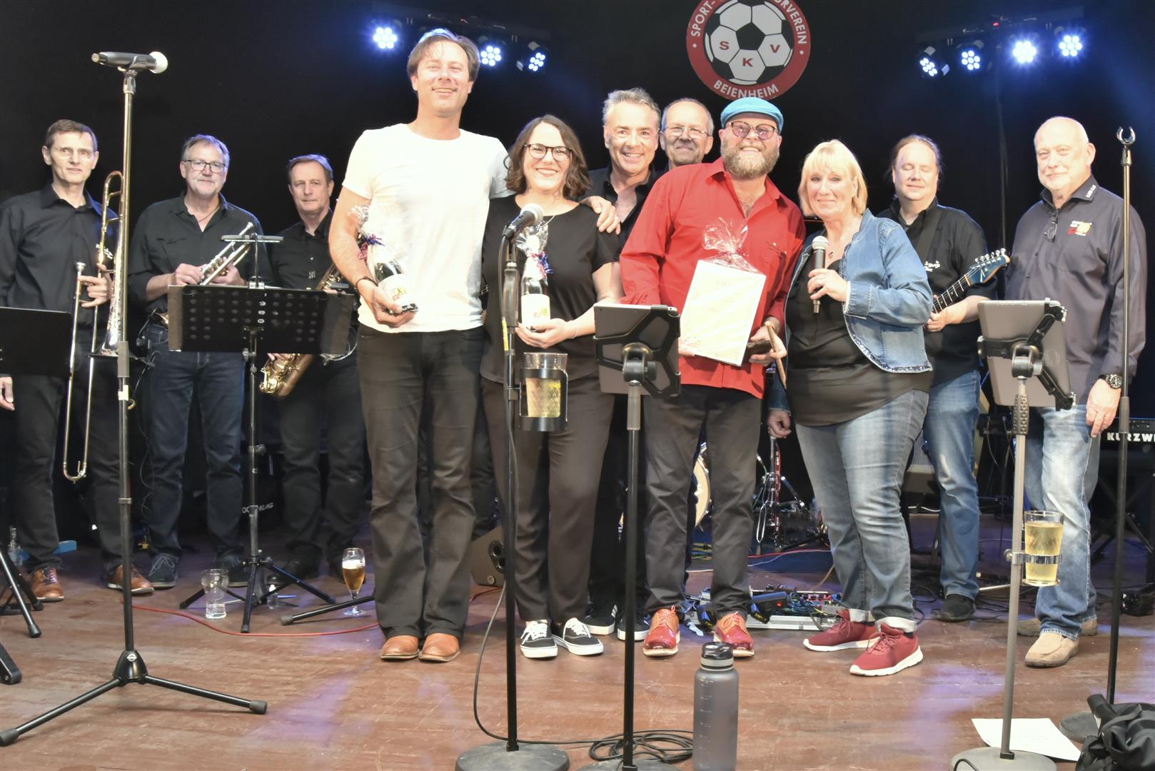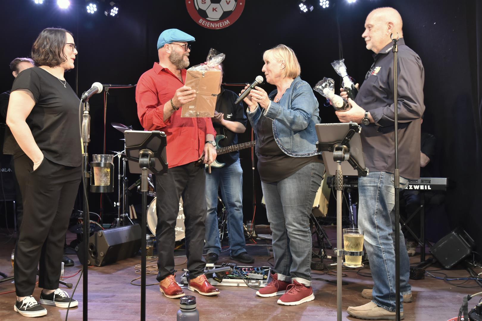 Als Überraschung des Abends überreichten Moni und Helmut der Band eine Urkunde zu ihrem 30-jährigen Bühnenjubiläum und zum Anstoßen auf ihr Jubiläum gab es noch den obligatorischen OCW-Schampus.