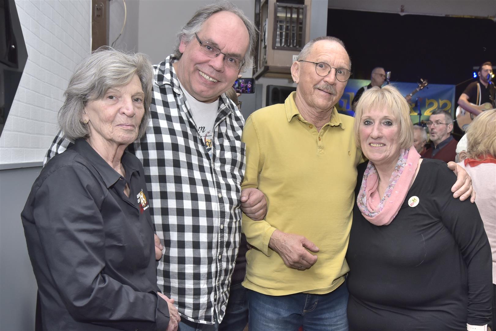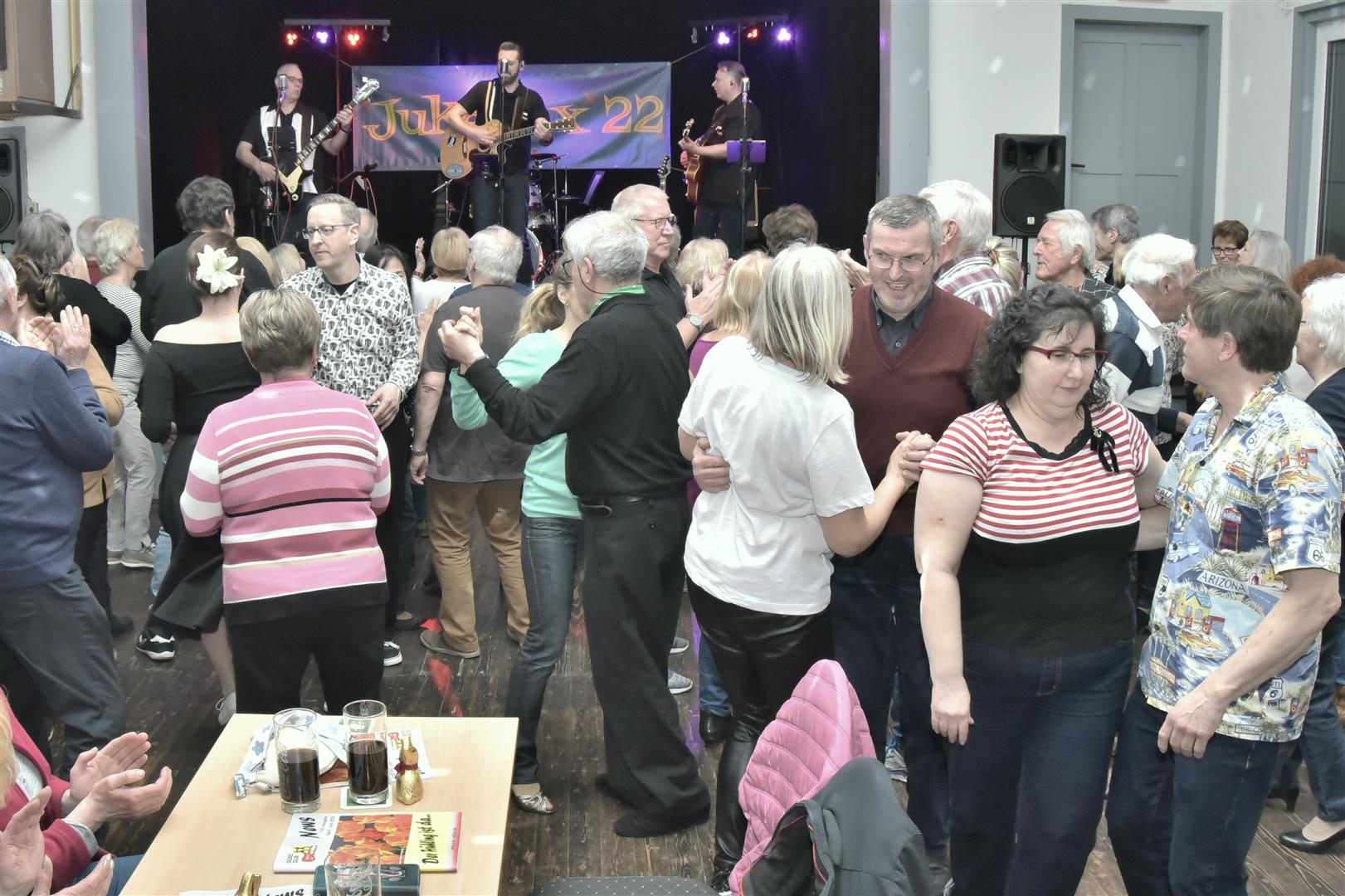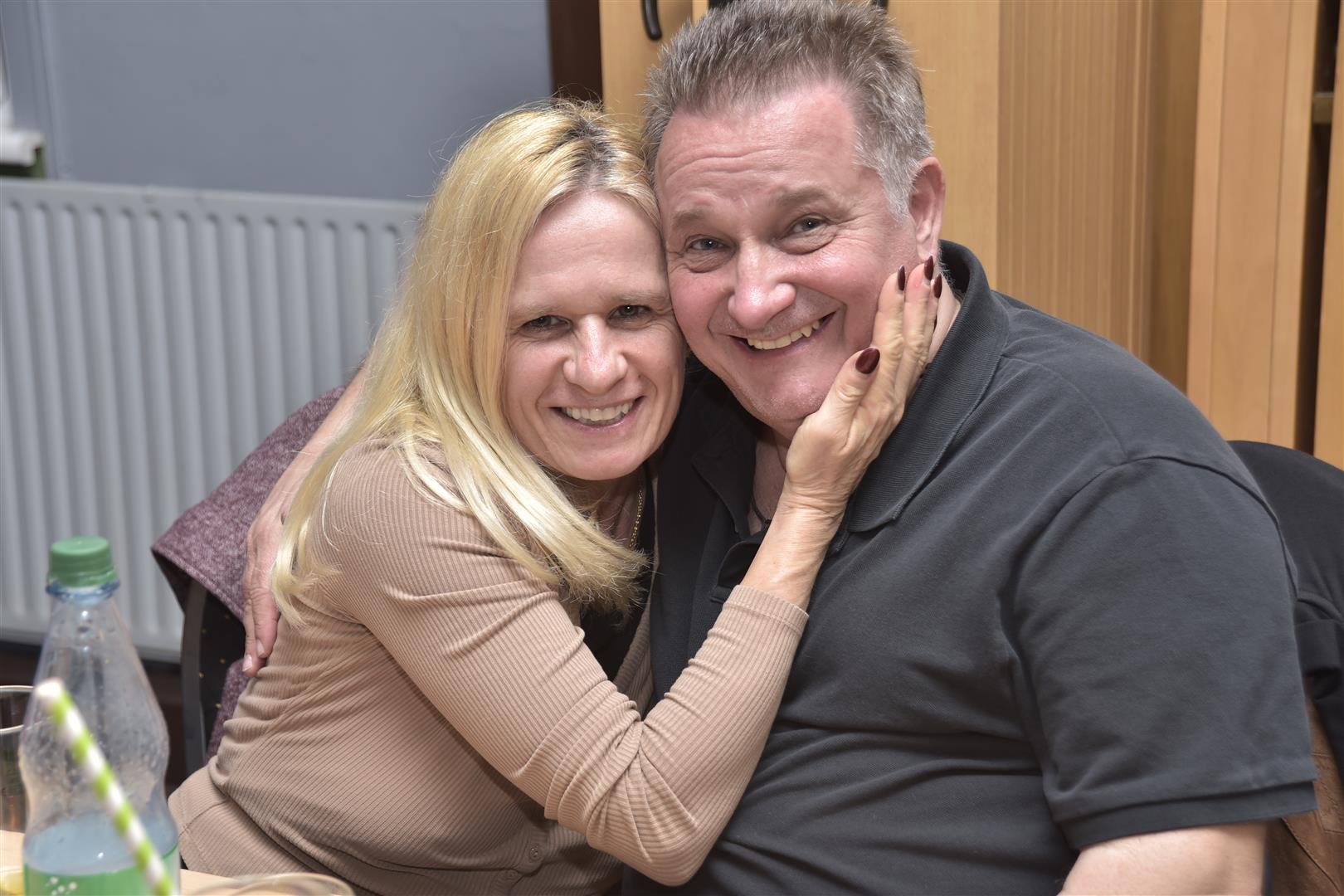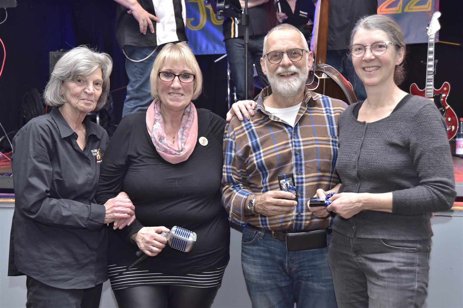 Diesmal ging es in die 50er und 60er Jahre, in die Blütezeit des Rock 'n' Roll. Das Raabennest war bis auf den letzten Platz besetzt und das Publikum war total begeistert von dem Repertoire der Band. Die Tanzfläche war ständig belegt. Mit Songs, wie „Blues Suede Shoes“,“Great Balls of fire“, „Johnny B. Good“ sowie auch „Biona Serra“ kamen alle ganz schön ins Schwitzen. Bei Schmusesongs „A Teenager in Love“, „Diana“ (von Paul Anka),“Dream Lover“ oder mit „Under The Boardwalk“ ging es dann etwas ruhiger zu. Das waren Songs aus längst vergangenen Zeiten, die man nie vergisst. In der Pause überraschten Roswitha und Moni unsere langjährigen Mitglieder Axel und Karola Pfadenhauer im Namen des Vorstandes mit der Ehrennadel in Silber. Diese Ehrennadeln für 15-jährige Mitgliedschaft hätten sie eigentlich schon in 2019 erhalten sollen. Dann kam ja bekanntlich Corona, somit konnten wir in 2023 nachträglich unserer treuen Mitglieder mit der Ehrennadel überraschen. Die Freude war groß, das sah man ihnen sichtlich an. So sollte es auch sein.