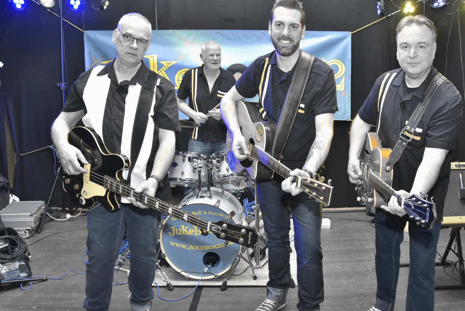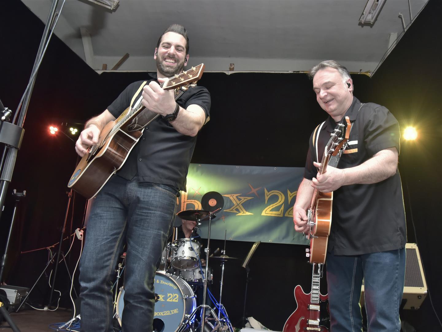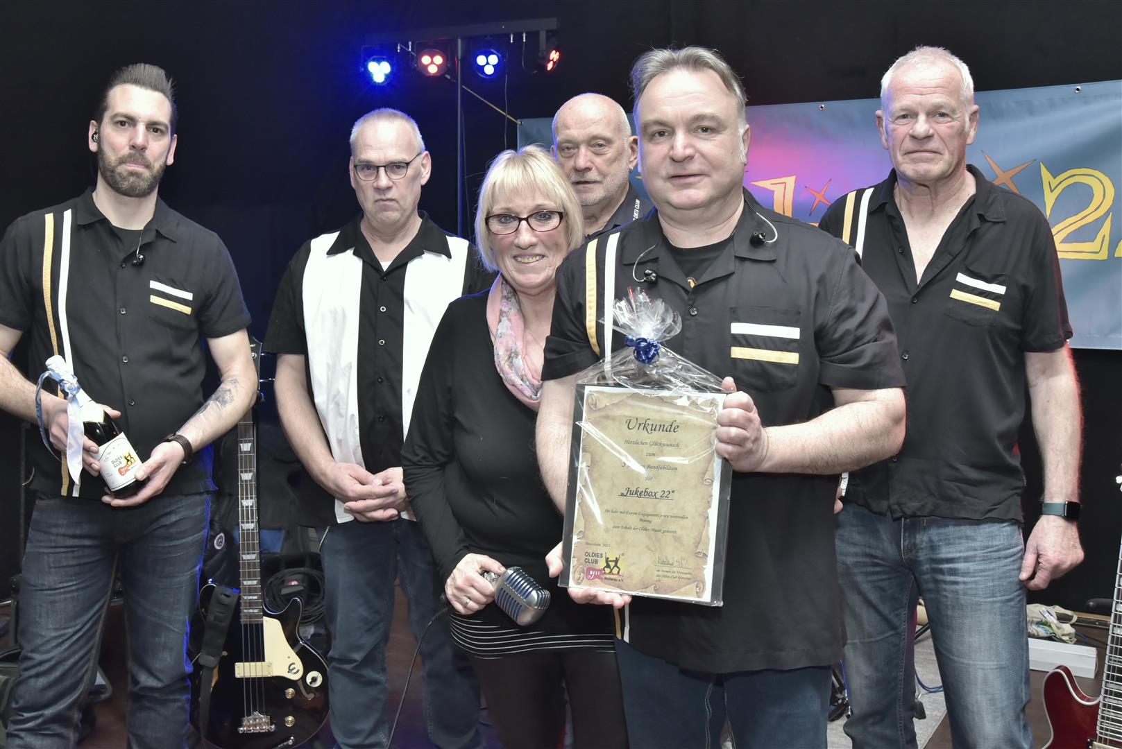 Dies war aber nicht die einzige Überraschung des Abends. Unsere Mitgliedsband „Jukebox22“ aus dem Rhein-Main Gebiet hatte sich Ende 2018 gegründet. Dies veranlasste uns, der Band eine Urkunde für 5-jährige Mitgliedschaft und eine Flasche OCW-Schampus zu überreichen. Patrick (Leadvocals, Gitarre), Erhan (Leadvocals, Gitarre), Andreas (Bass, Vocal) und Harry an den Drums waren freudig überrascht und bedankten sich herzlich beim OCW.