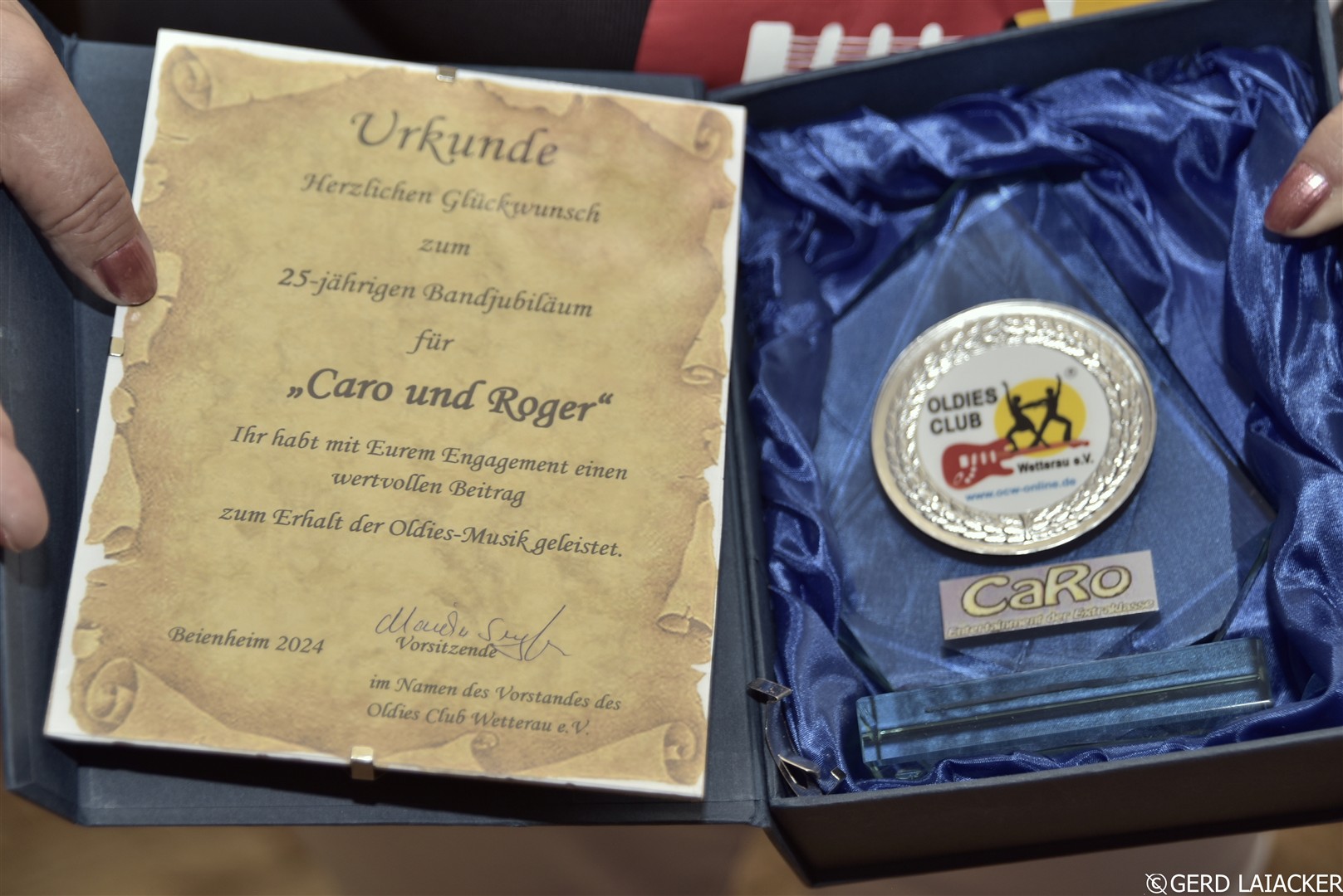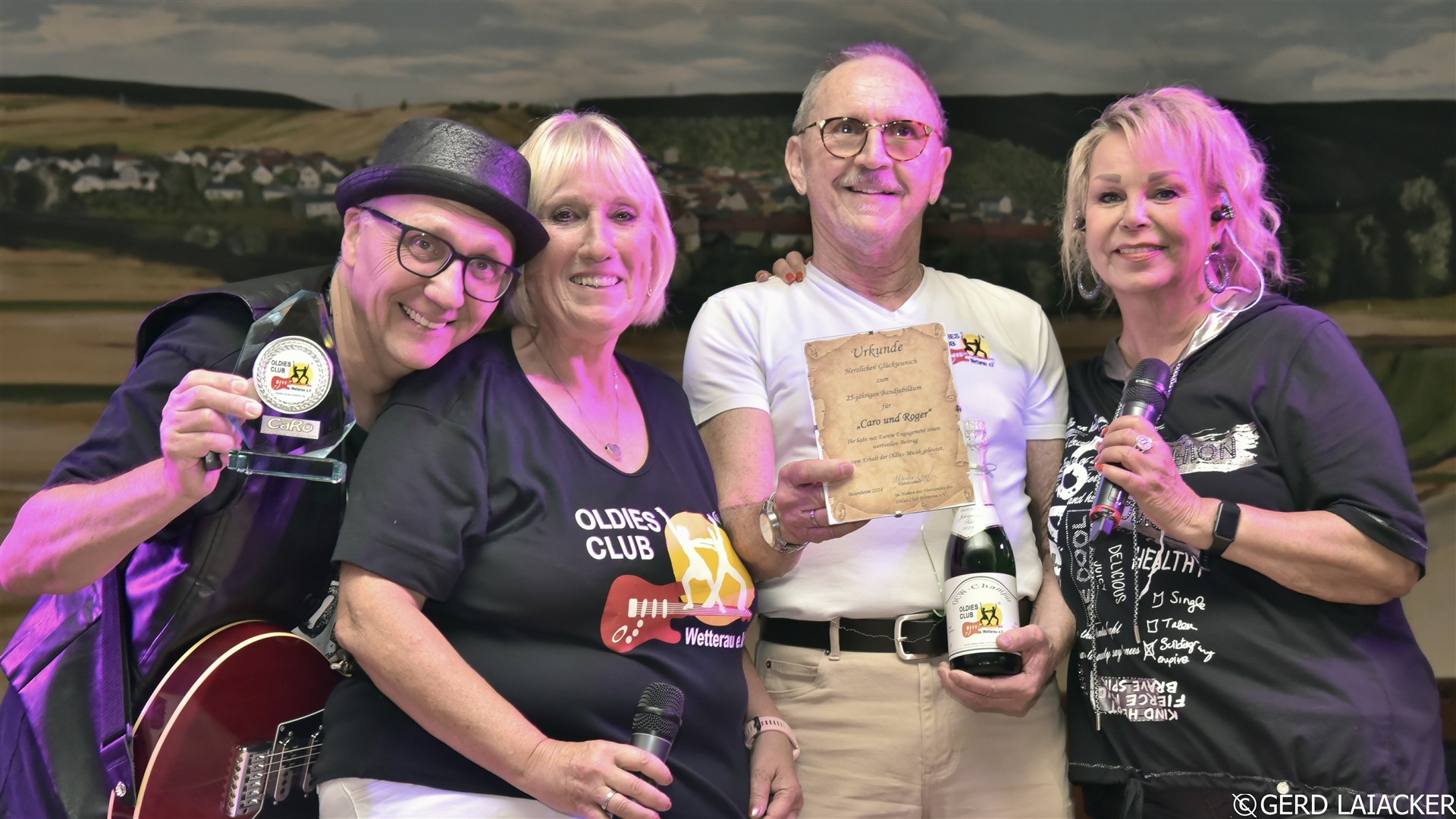 Kurz vor dem zweiten Set sorgten Moni und Eric im Namen des Vorstandes für einen emotionalen Höhepunkt: Caro und Roger wurden mit einer Glastrophäe und einer Urkunde für ihr 25-jähriges Bühnenjubiläum geehrt. Die Überraschung war gelungen – die Freude war den beiden deutlich anzusehen. Auch unser Mitglied Stella Miliziano-Bender wurde gefeiert: Sie erhielt zum Geburtstag ein Fläschchen OCW-Schampus und es gab noch ein Geburtstagsständchen dazu. Herzlichen Glückwunsch!