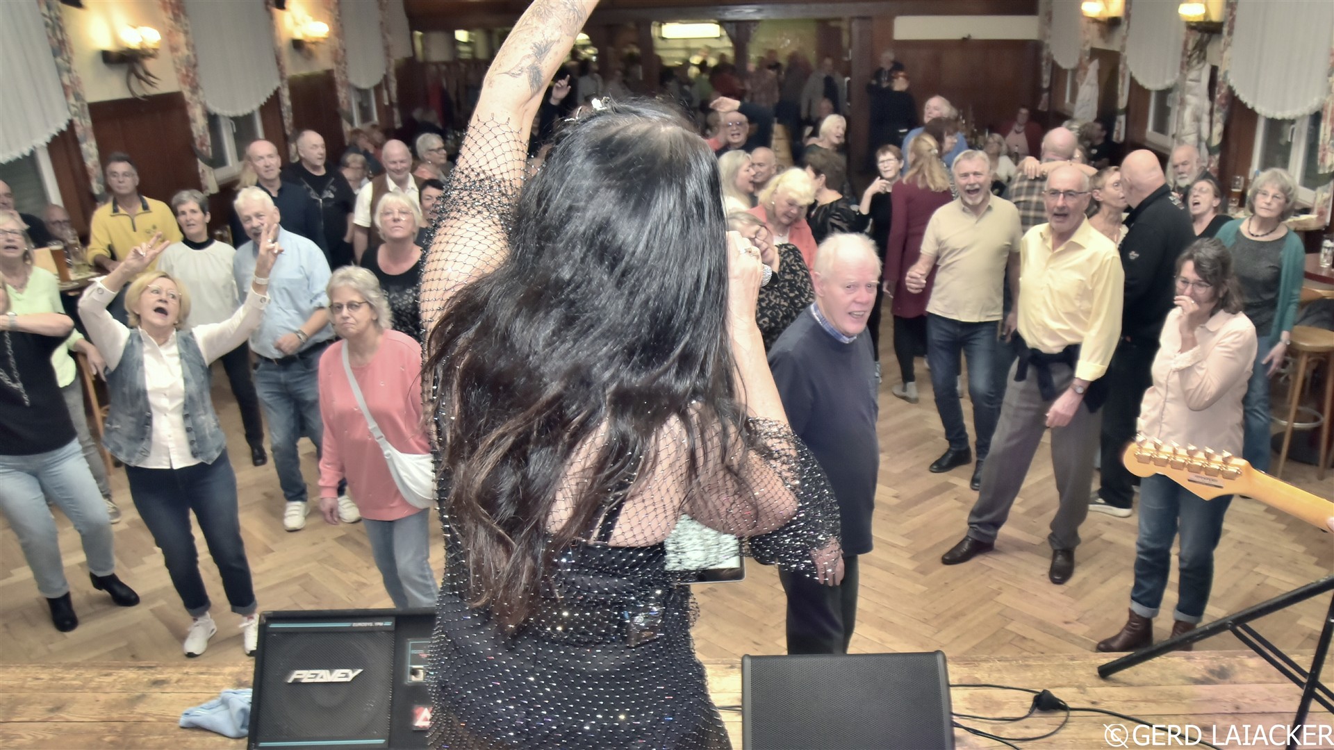 Nachdem Moni alle Gäste und die Band herzlich begrüßte, ging es dann auch schon mit Robert Palmer´s „Addicted to love“ und mit „Aint nobody „von Chaka Khan so richtig los. Und wie an jedem Clubabend so üblich, war die Tanzfläche gleich belegt. Ein besonderes Highlight war der Auftritt der Gastsängerin Andrea, die mit ihrer eigenen Band „Smart“ unterwegs ist. Mit ihrer starken Stimme begeisterte sie das Publikum bei „Nutbush City Limits“ und „The Best“ und erinnerte eindrucksvoll an die unvergessene Tina Turner. Martin Maasz, der neue Frontsänger der Band legte mit dem Weltklassiker „Unchain my heart von Joe Cocker so richtig los. Das hörte sich super an und es gab vom Publikum dafür frenetischen Applaus.