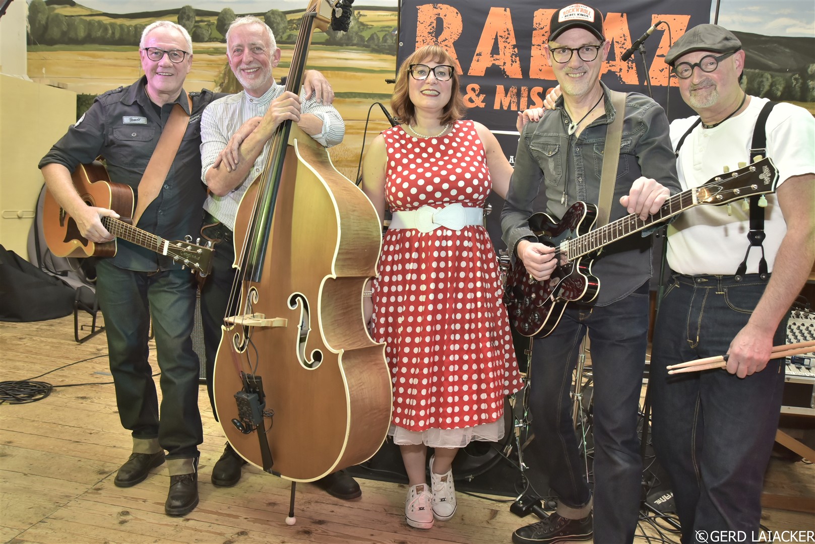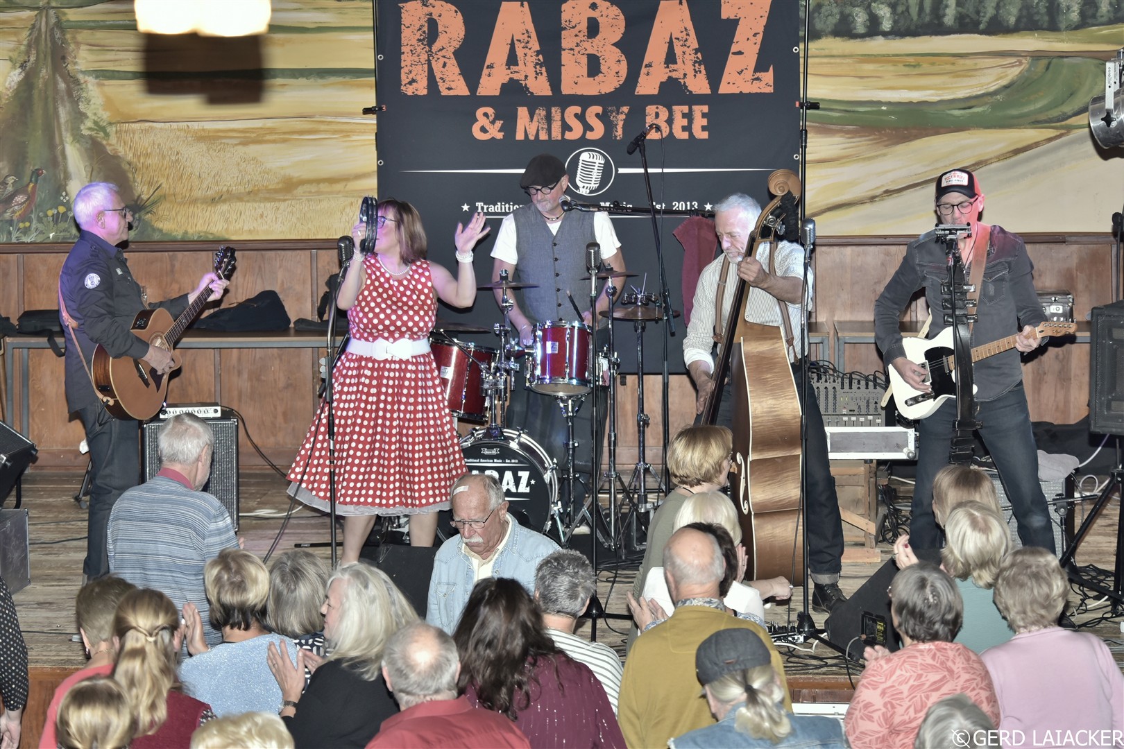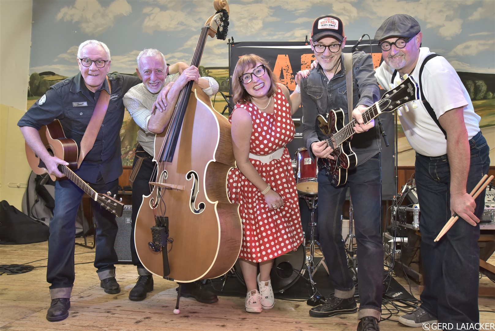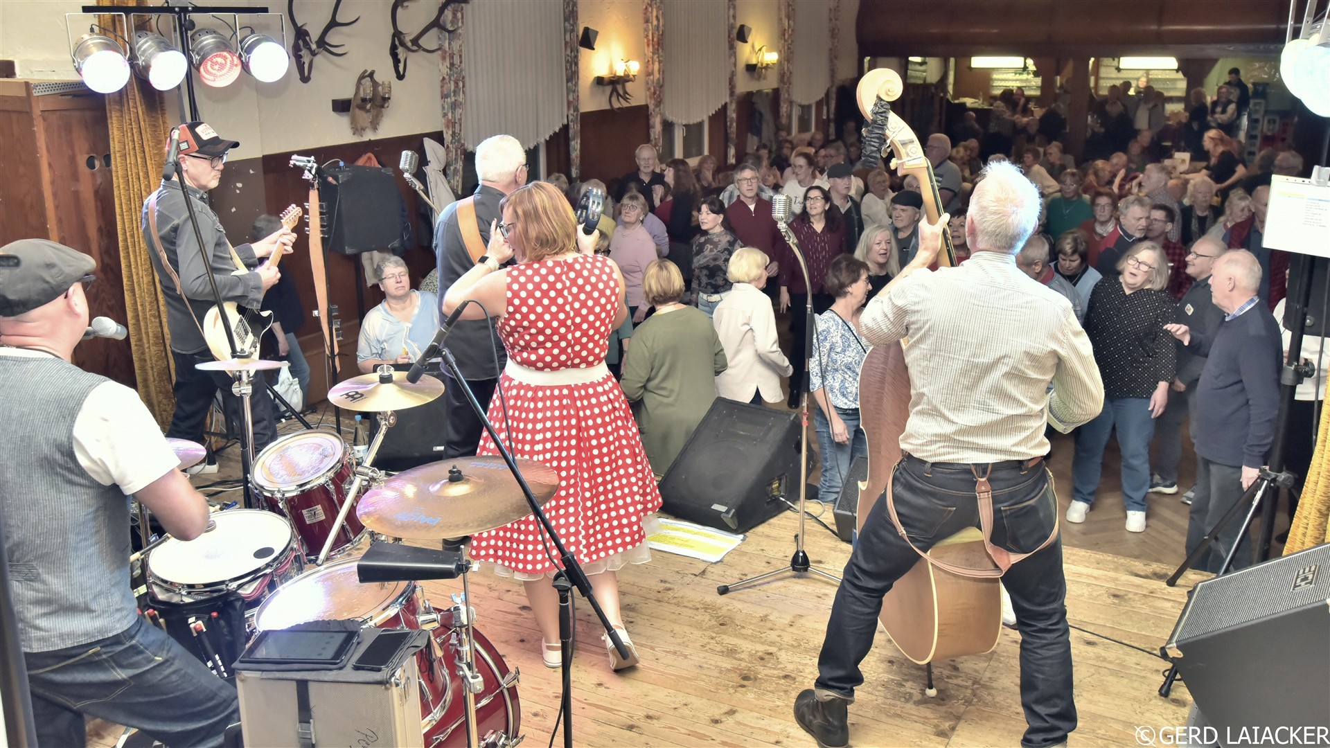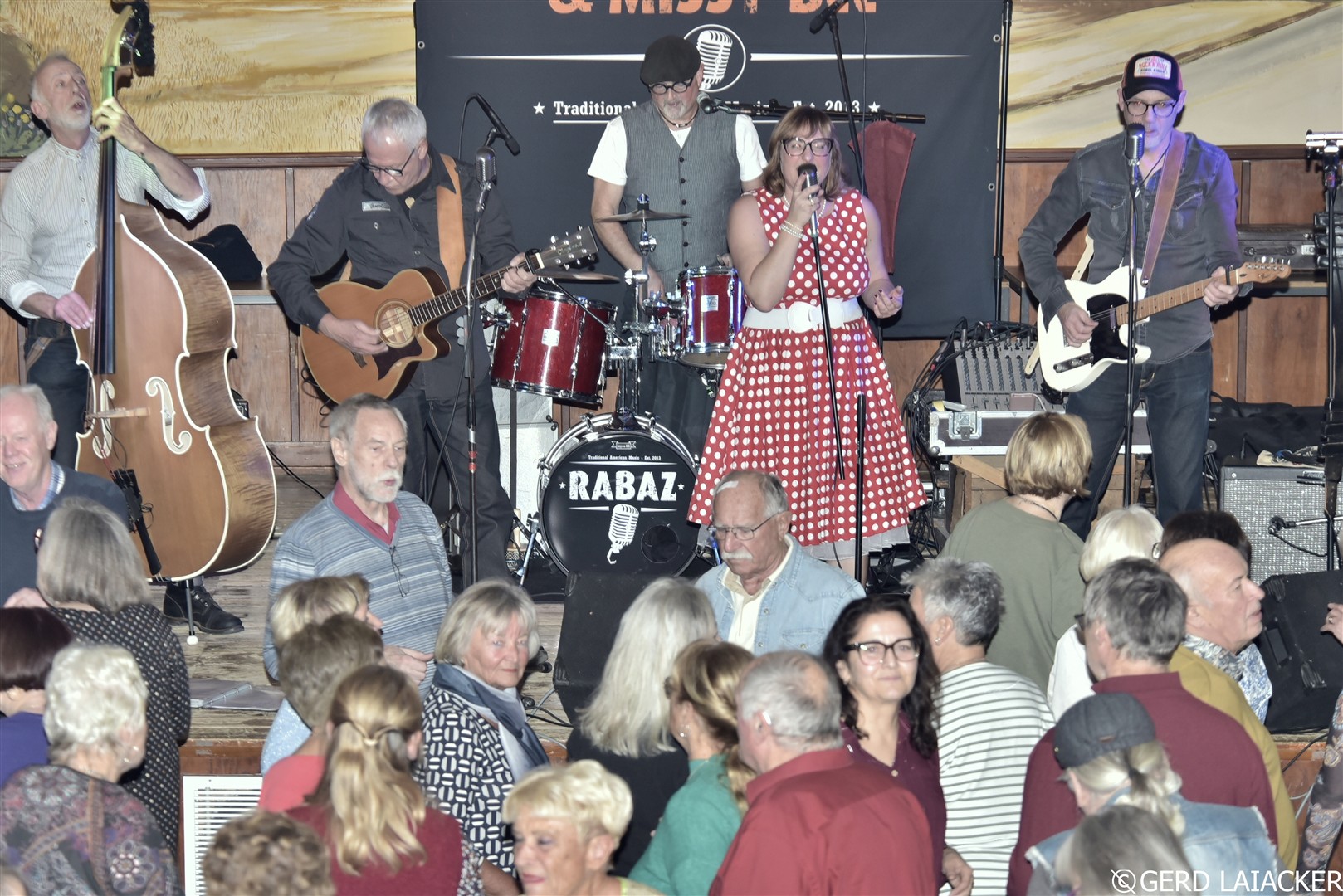 Nachdem Moni die Gäste herzlich begrüßte und einen schwungvollen Abend versprach, füllte sich die Tanzfläche schon bei den ersten Songs „Good Rocking Tonight“ von Roy Brown und „Get Rhythm“ von Johnny Cash. Die Spielfreude und Leidenschaft der Musiker waren deutlich spürbar und übertrugen sich sofort auf das Publikum, die begeistert mitsangen und mittanzten. Missy Bee überzeugte nicht nur mit ihrer Stimme, sondern auch mit ihrem stilechten Outfit im 50er-Jahre-Look, das perfekt zum Repertoire passte. Gemeinsam mit Ralf Schneider an Vocals, Harmonica, Guitar und Mandolin, Achim Karn am Kontrabass, Manfred Bürner an Vocals und Guitar sowie Joachim Kreher an Vocals, Drums und Percussion bot die Band ein harmonisches Zusammenspiel, das vom Publikum mit großem Applaus gefeiert wurde.