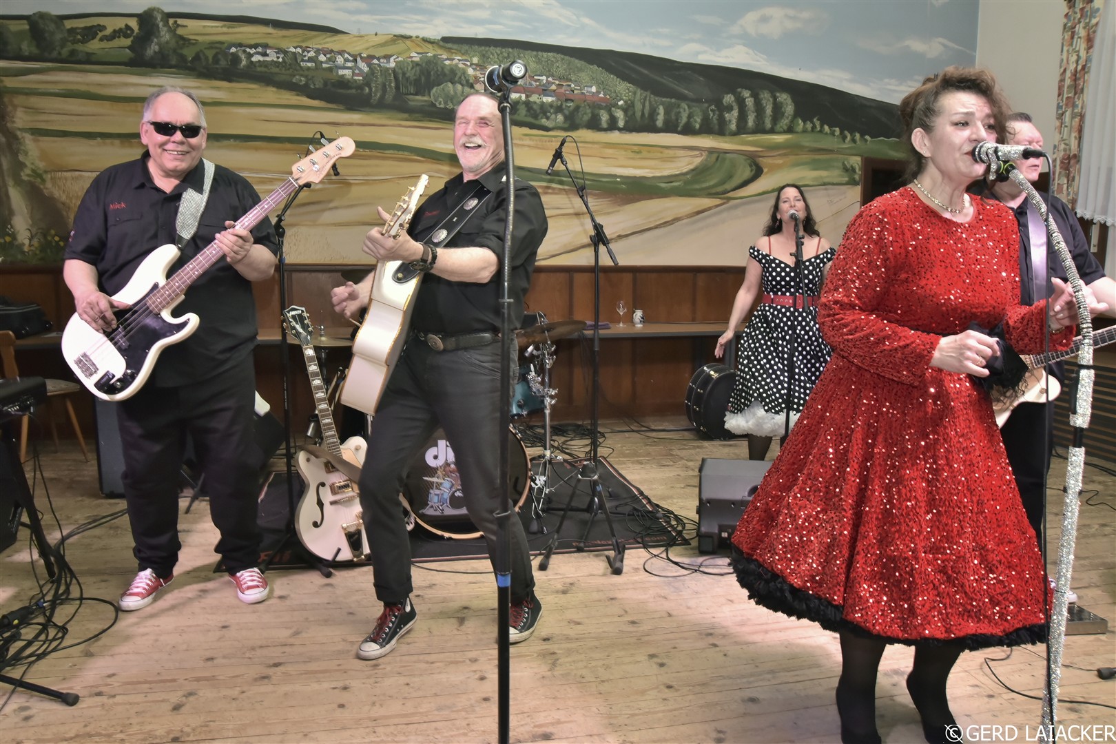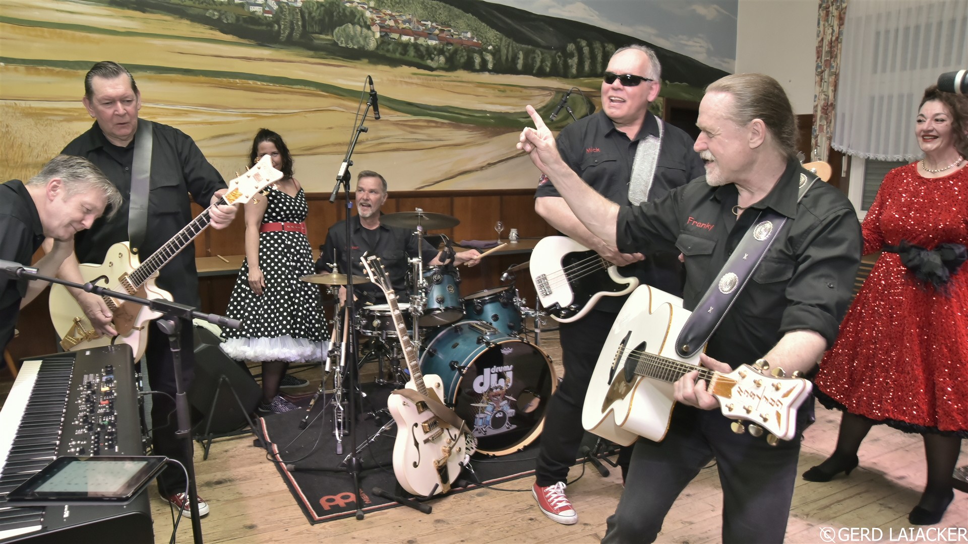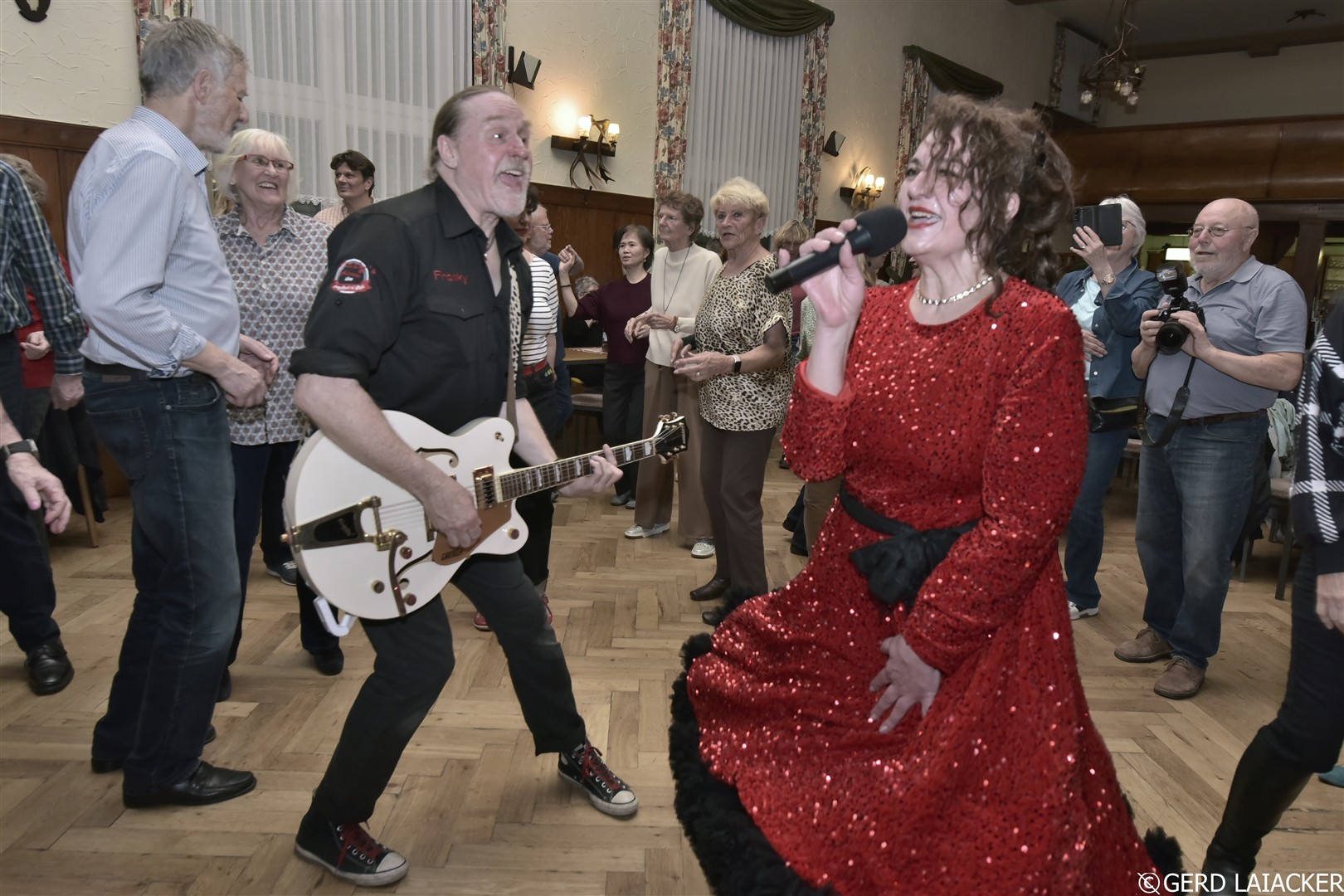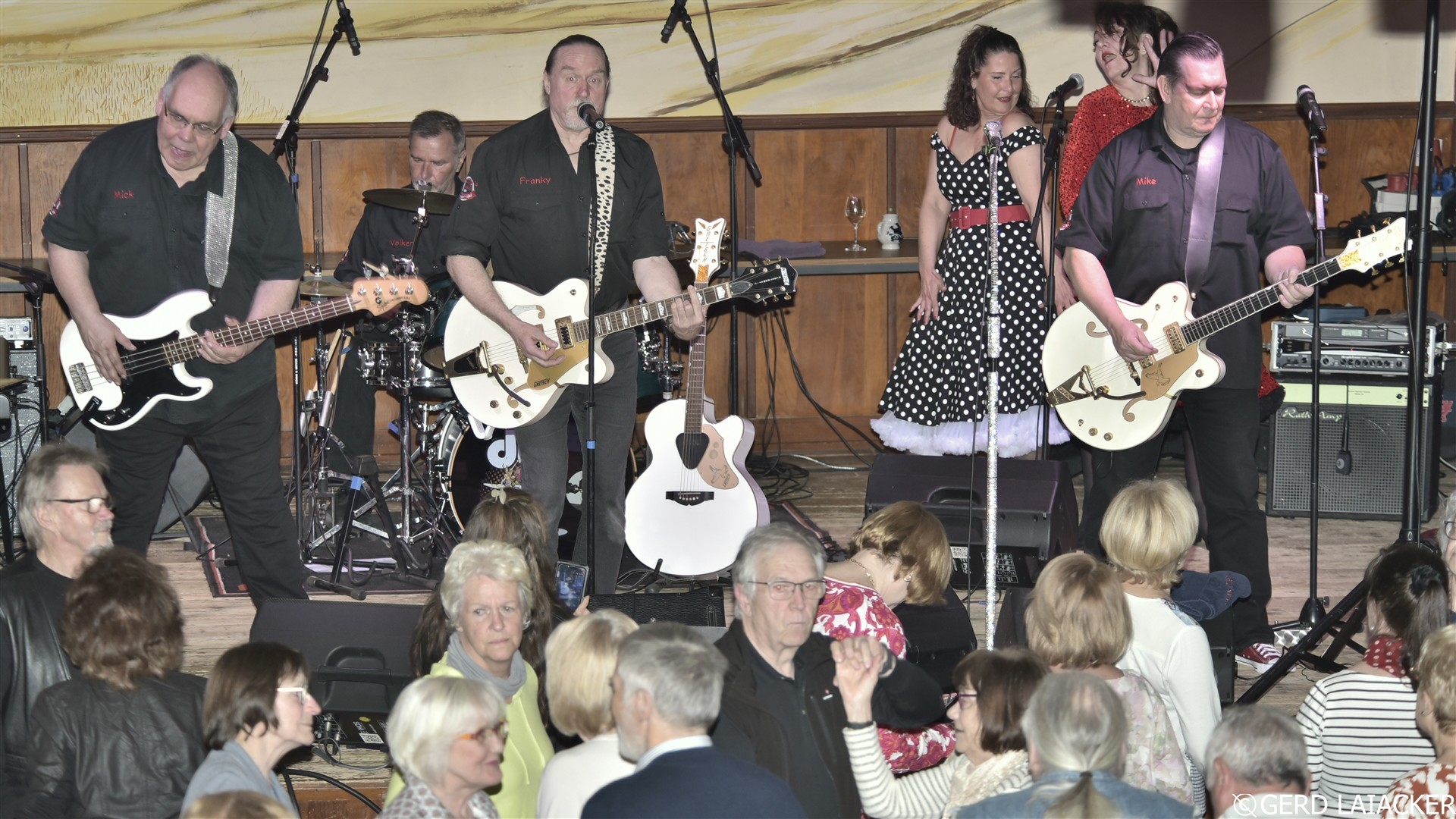 Wie gewohnt eröffnete Moni den Clubabend mit einer herzlichen Begrüßung und dem Versprechen eines Abends voller Rock’n’Roll – ein Versprechen, das Franky’s Allstars vom ersten Ton an einlösten. Bereits bei „Let’s Twist Again“ stürmten die Gäste die Tanzfläche. Mit „Sexy Hexi“ und einem schwungvollen Rock’n’Roll‑Medley war die Stimmung endgültig auf dem Höhepunkt. Es wurde getanzt und getwistet, was das Zeug hielt. Die Band überzeugte mit einer vielseitigen Setliste voller Evergreens. Die Sängerinnen Branka und Britta entführten das Publikum mit ihrem an die 50er und 60er Jahre angelehnten Stil in die Vergangenheit und präsentierten Songs wie „Schöner fremder Mann“ auf unverwechselbare Weise. Spätestens beim Schmusesong „Blue Hotel“, gefühlvoll gesungen von Franky, waren die Herzen der Zuhörer erobert – besonders Monis, die diesen Titel ganz besonders liebt.