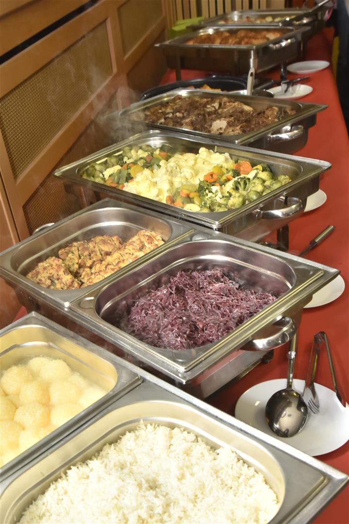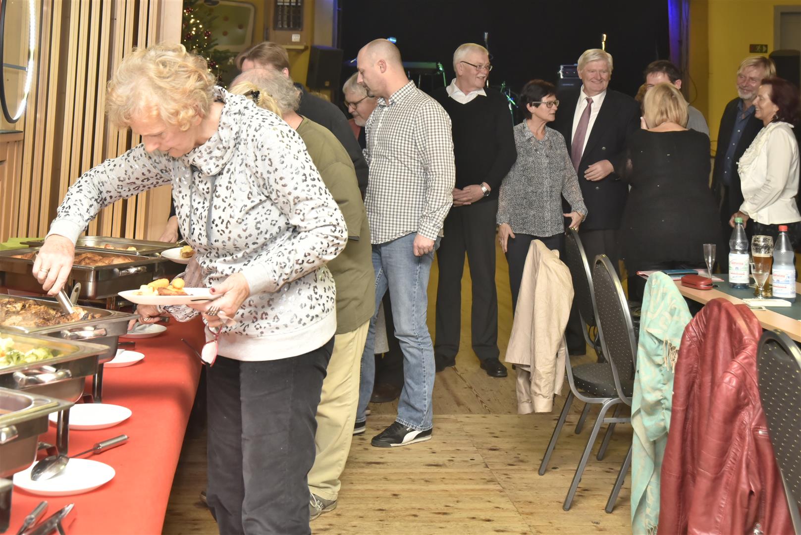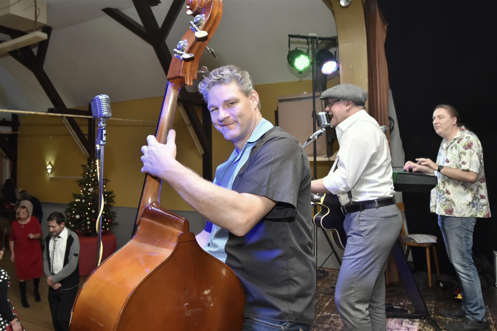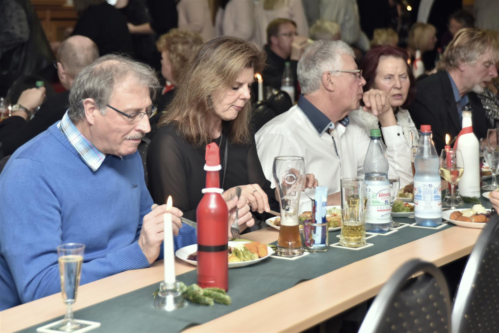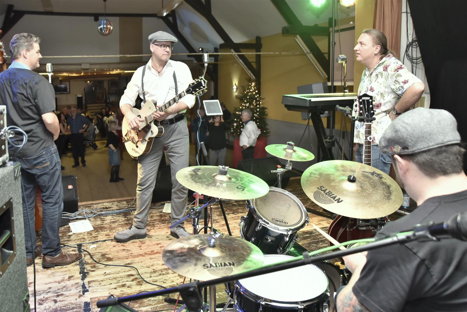 Danach konnte sich jeder erst einmal stärken und das hervorragende Weihnachtsbüffet genießen. Mit der Band „Buddy & the Sharks“ hatten wir eine sehr gute Wahl getroffen. Es ging ziemlich rockig zu und ein paar Pfunde konnten zugleich wieder abgetanzt werden. Die Songs von den Blues Brothers oder Jerry Lee Lewis sowie von Elvis, wie unter anderem „That's All Right, Mama“ oder „Heartbreak Hotel“ kamen super beim Publikum an, ganz besonders bei den Vertretern des Elvis-Presley-Vereins mit ihrem Präsidenten Günter Kiefer, die uns die Ehre ihres Besuchs erwiesen.