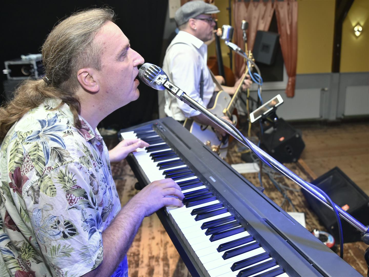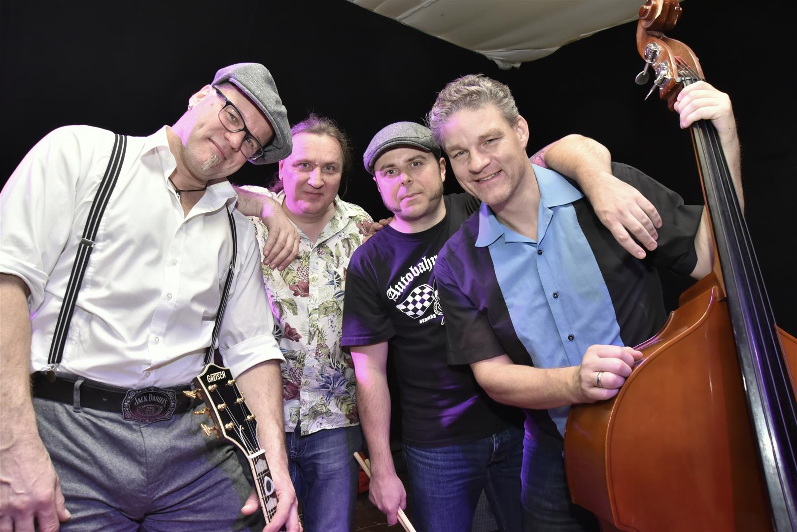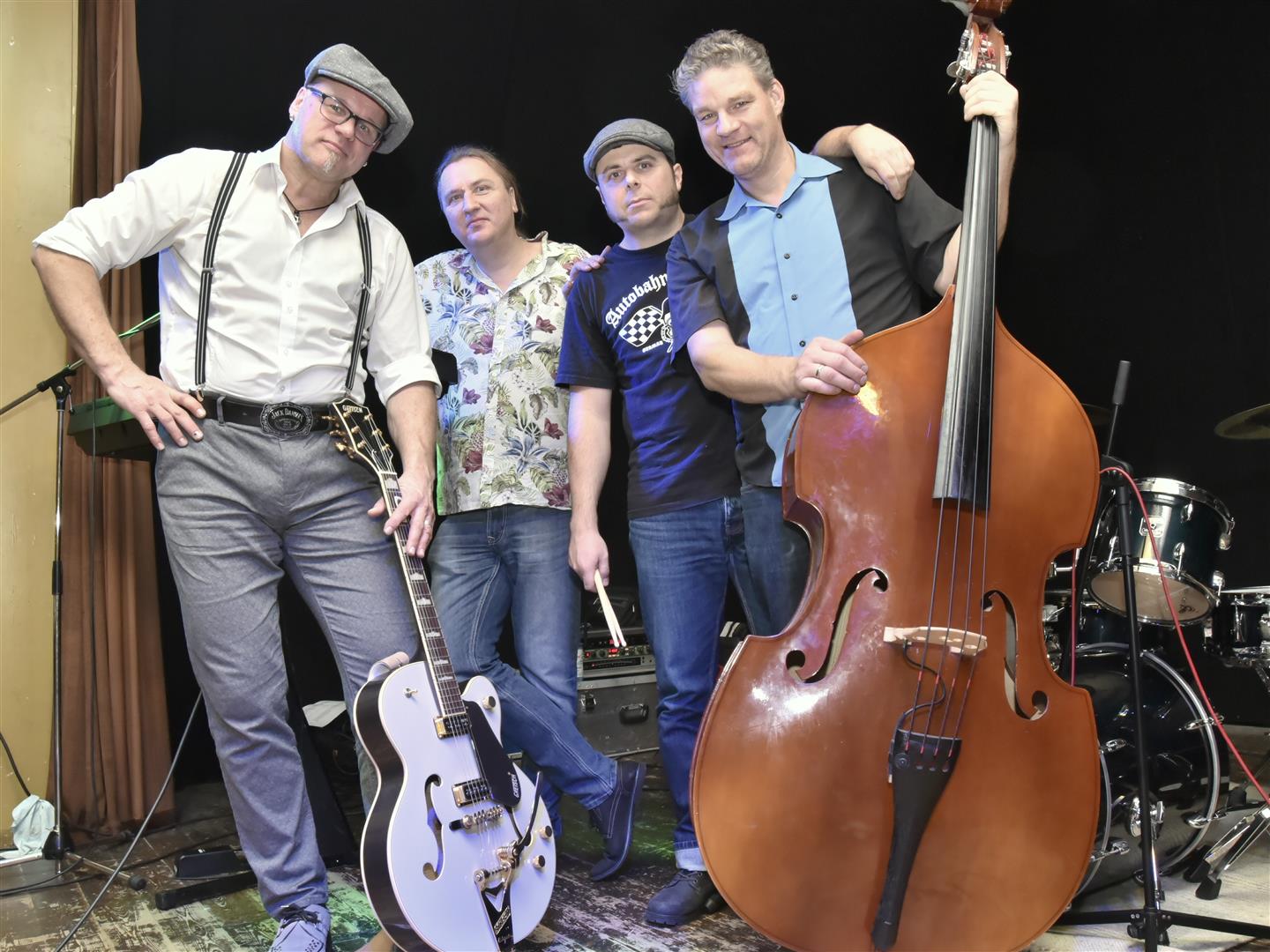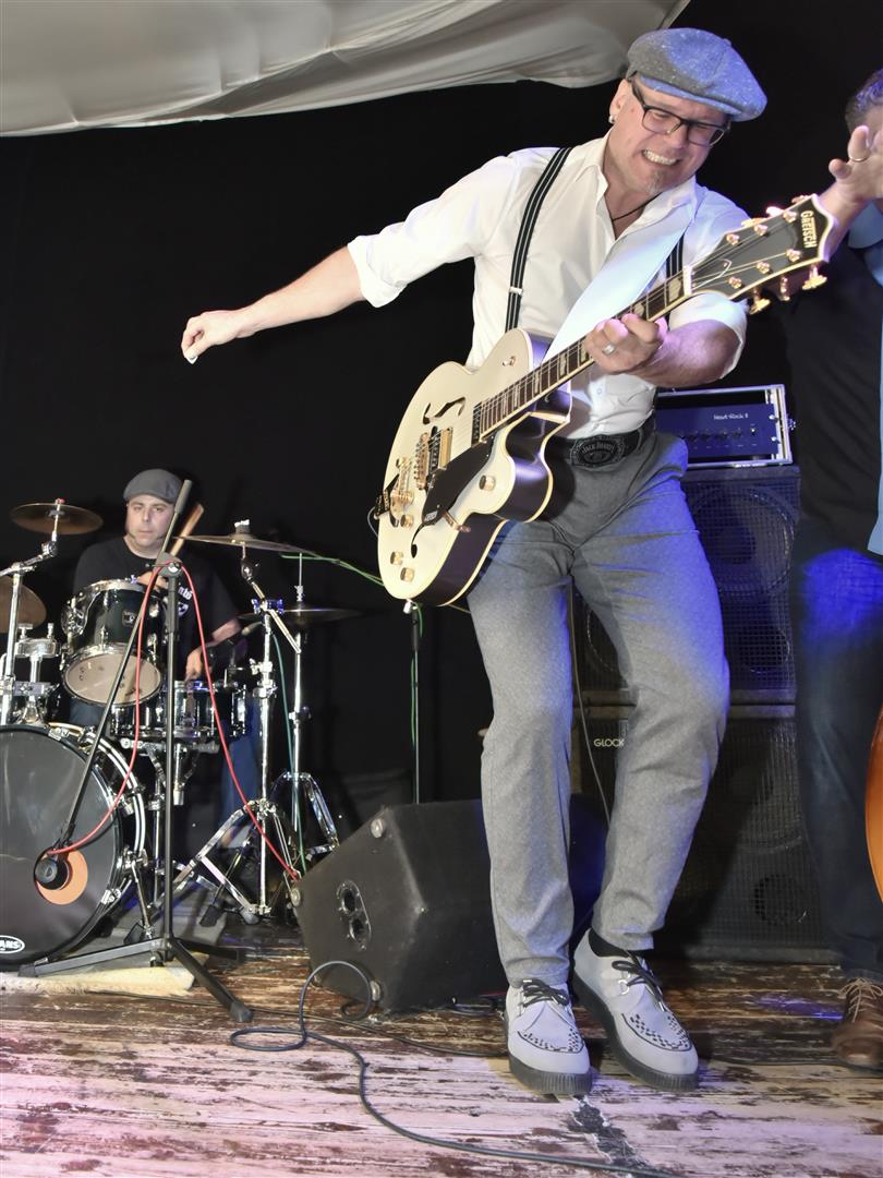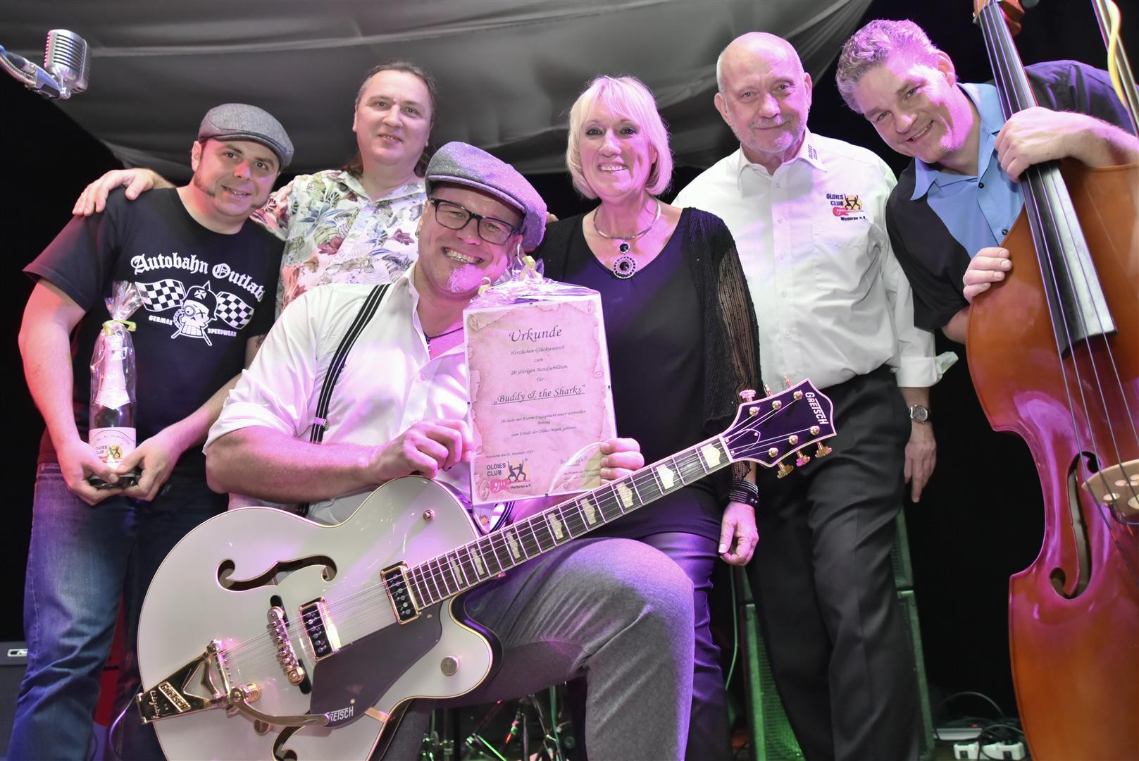 Die Band verbreitete weiter eine tolle Stimmung und es wurde getanzt, was das Zeug hielt. Bei Klassikern wie „Jailhouse Rock“, „Blue Suede Shoes“ oder „Shake, Rattle and Roll“ kann man einfach nicht sitzen bleiben. „Buddy & The Sharks“ sind bereits seit 1999 Mitglied im OCW und feiern in diesem Jahr ihr 20-jähriges Bühnenjubiläum. Eine hervorragende Leistung. Moni und Helmut überreichten der Band zur Überraschung eine Urkunde und eine Flasche OCW-Schampus und bedankten sich gleichzeitig für ihre tollen Songs. „Buddy & the Sharks”, das sind Georg „Buddy” Krüger (Lead Vocals, Gretsch- & Gibson-Guitars), Andreas „Taschi” Simon (Double-Bass, E-Bass & Backing Vocals), Aleksander Misic (Piano, Lead & Backing Vocals) und Drummer Stephan Gruza. Ein wirklich tolles Team. Das Publikum war begeistert. Man hätte noch stundenlang weiter zuhören und tanzen können, aber leider muss nun einmal auch der schönste Abend zu Ende gehen.