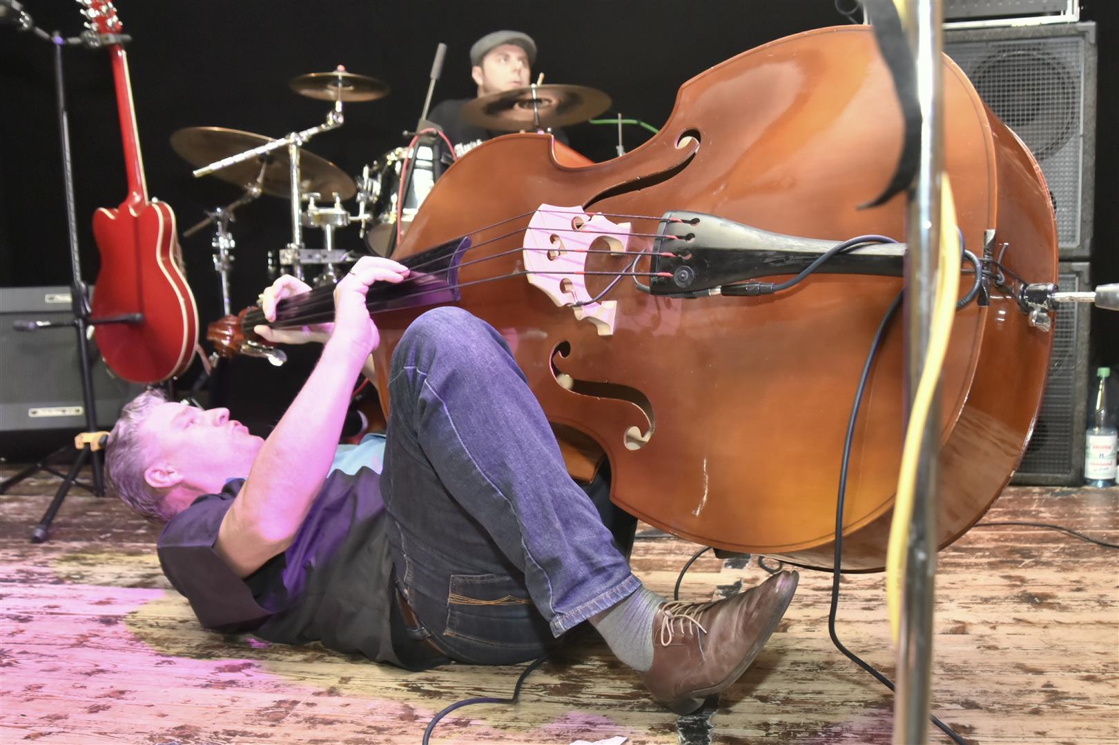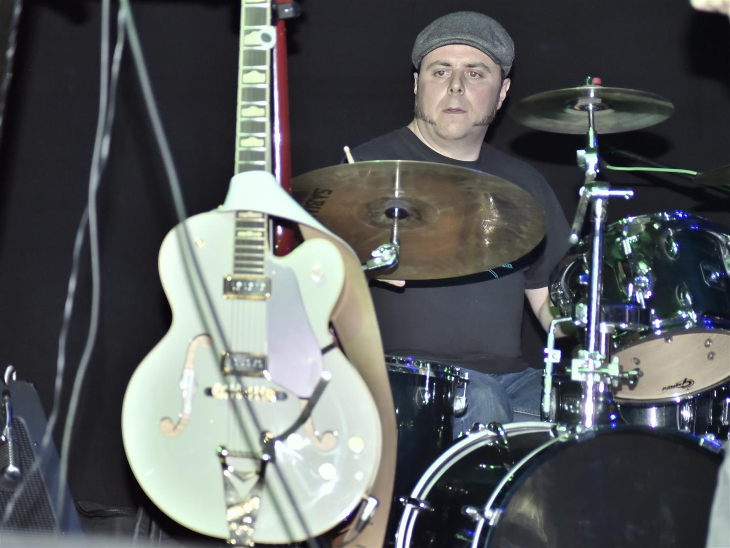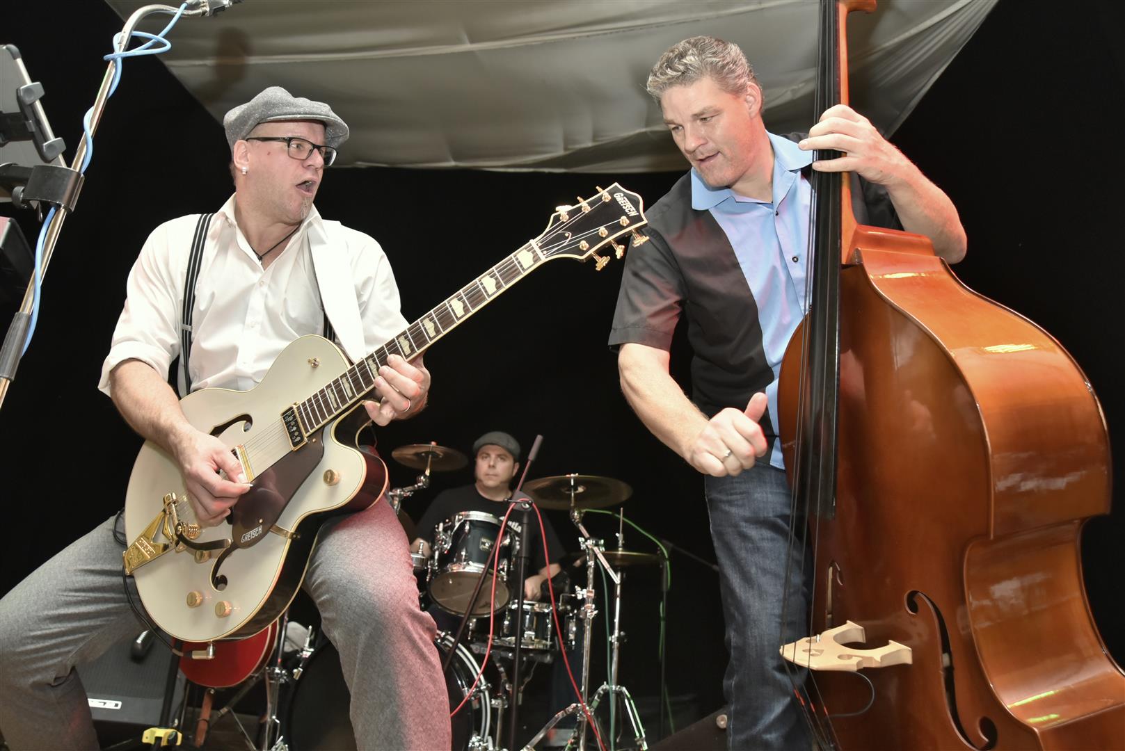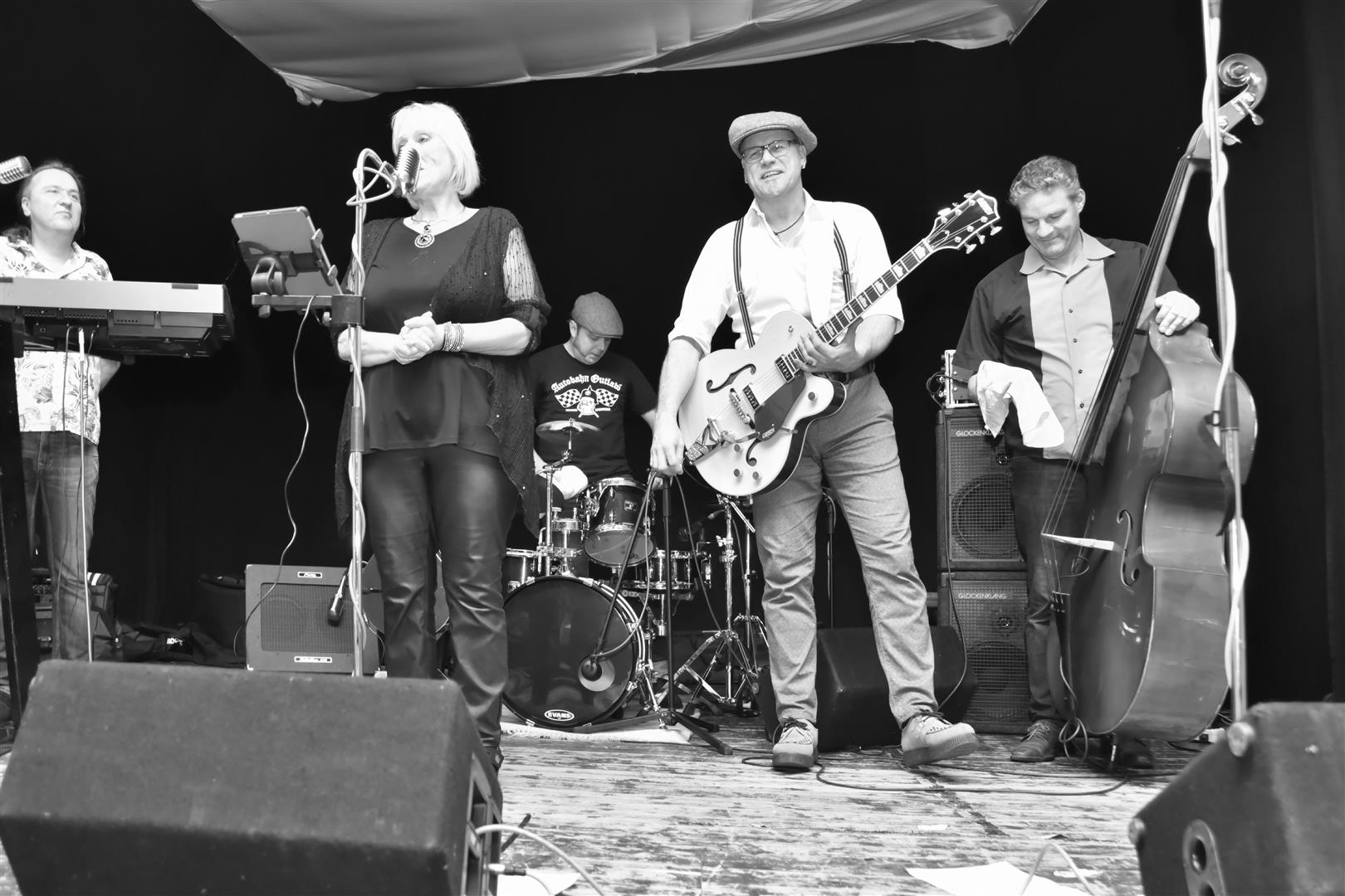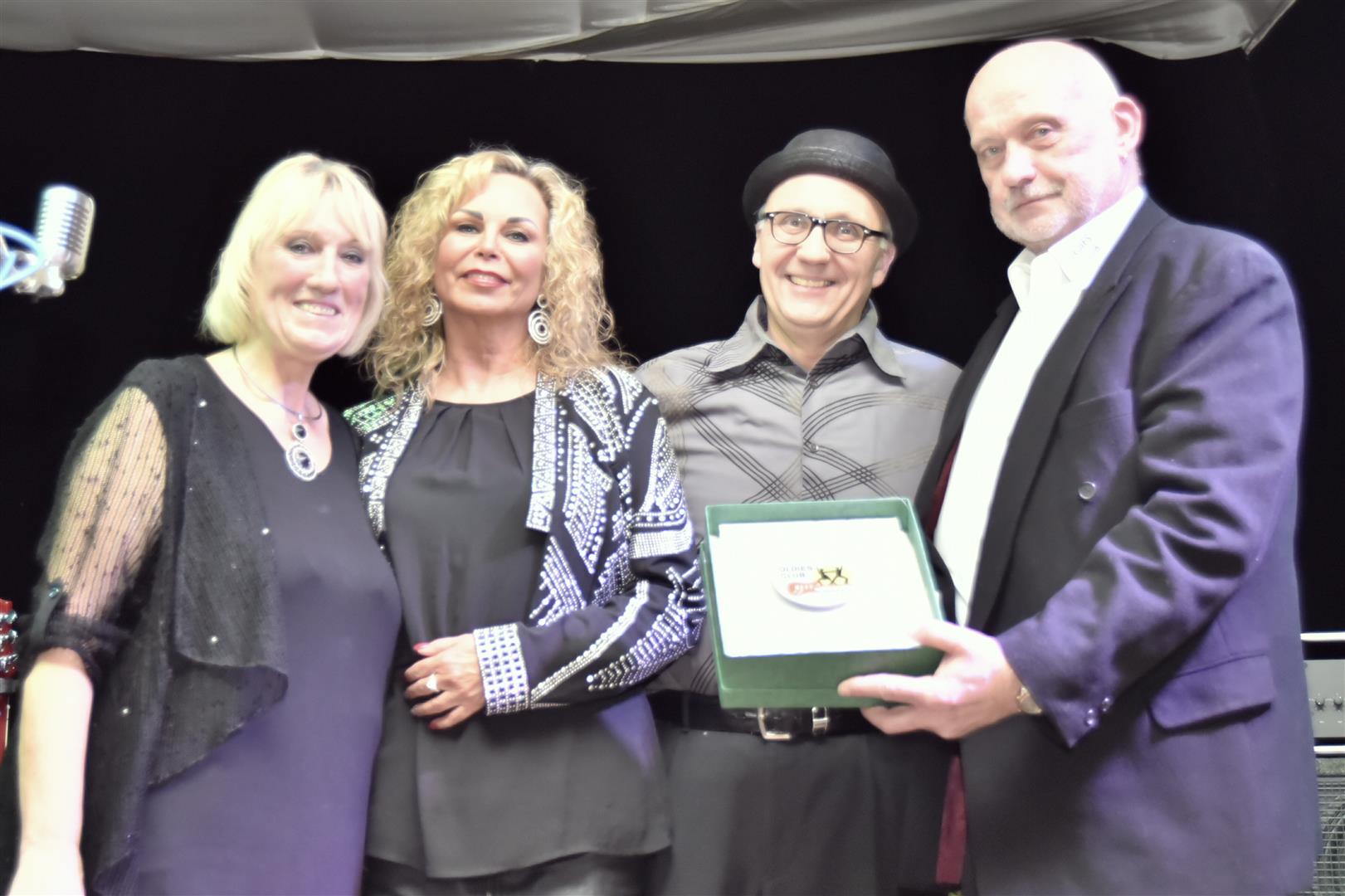 Die Band verbreitete weiter eine tolle Stimmung und es wurde getanzt, was das Zeug hielt. Bei Klassikern wie „Jailhouse Rock“, „Blue Suede Shoes“ oder „Shake, Rattle and Roll“ kann man einfach nicht sitzen bleiben. „Buddy & The Sharks“ sind bereits seit 1999 Mitglied im OCW und feiern in diesem Jahr ihr 20-jähriges Bühnenjubiläum. Eine hervorragende Leistung. Moni und Helmut überreichten der Band zur Überraschung eine Urkunde und eine Flasche OCW-Schampus und bedankten sich gleichzeitig für ihre tollen Songs. „Buddy & the Sharks”, das sind Georg „Buddy” Krüger (Lead Vocals, Gretsch- & Gibson-Guitars), Andreas „Taschi” Simon (Double-Bass, E-Bass & Backing Vocals), Aleksander Misic (Piano, Lead & Backing Vocals) und Drummer Stephan Gruza. Ein wirklich tolles Team. Das Publikum war begeistert. Man hätte noch stundenlang weiter zuhören und tanzen können, aber leider muss nun einmal auch der schönste Abend zu Ende gehen.