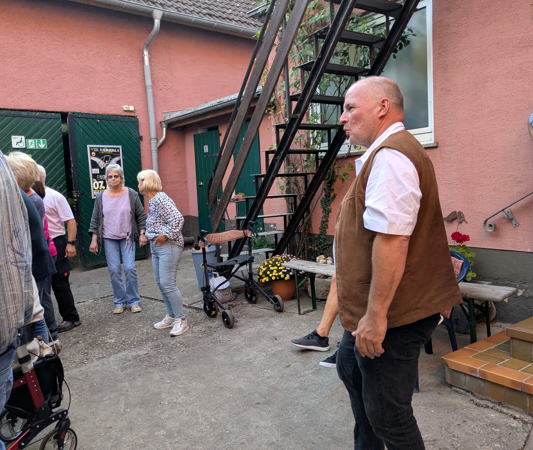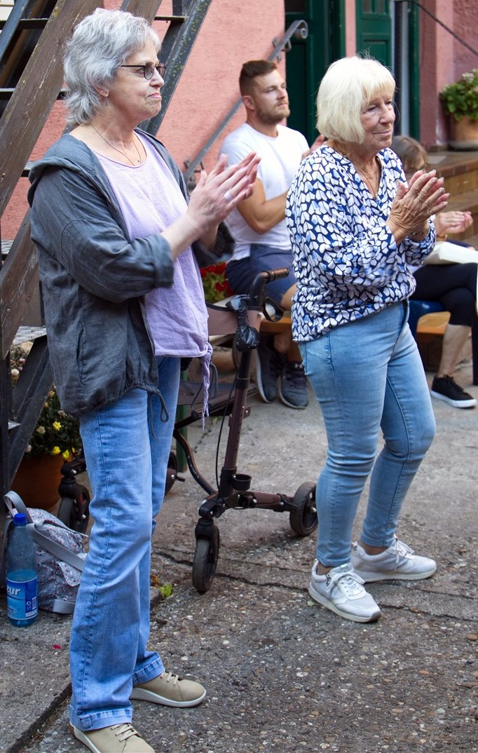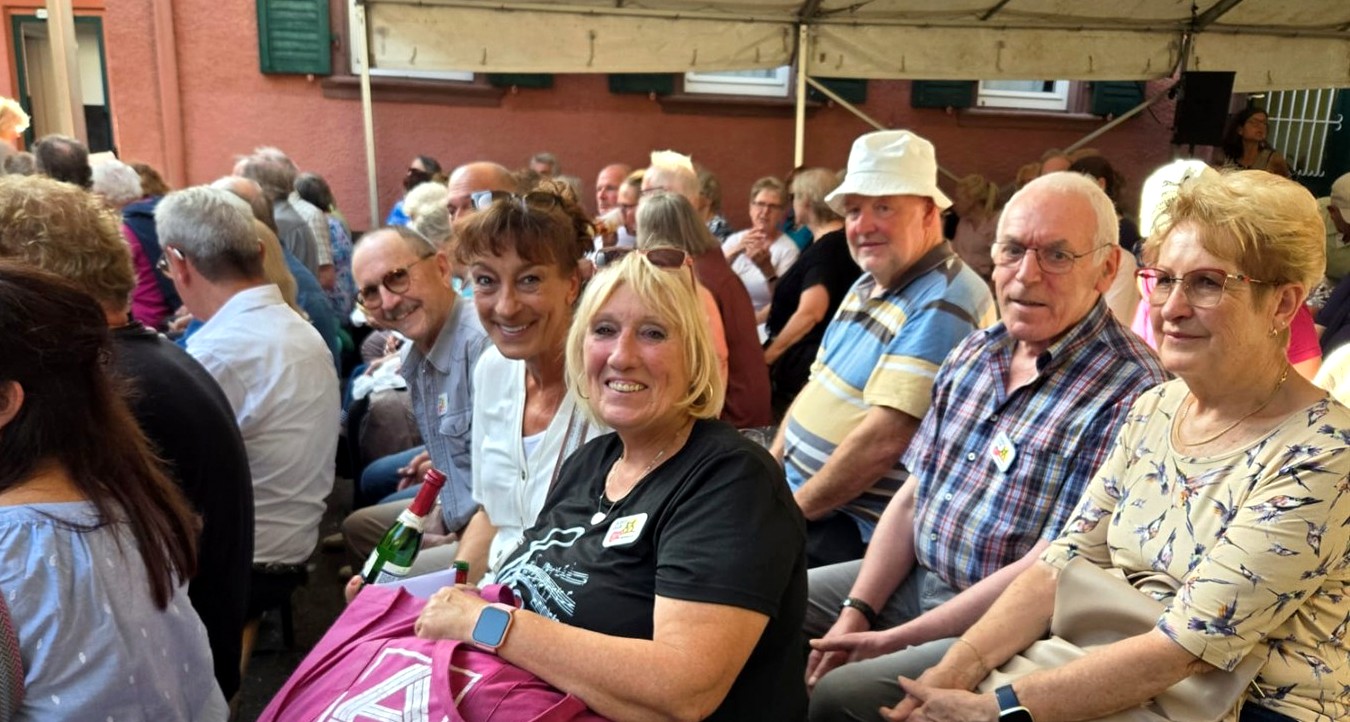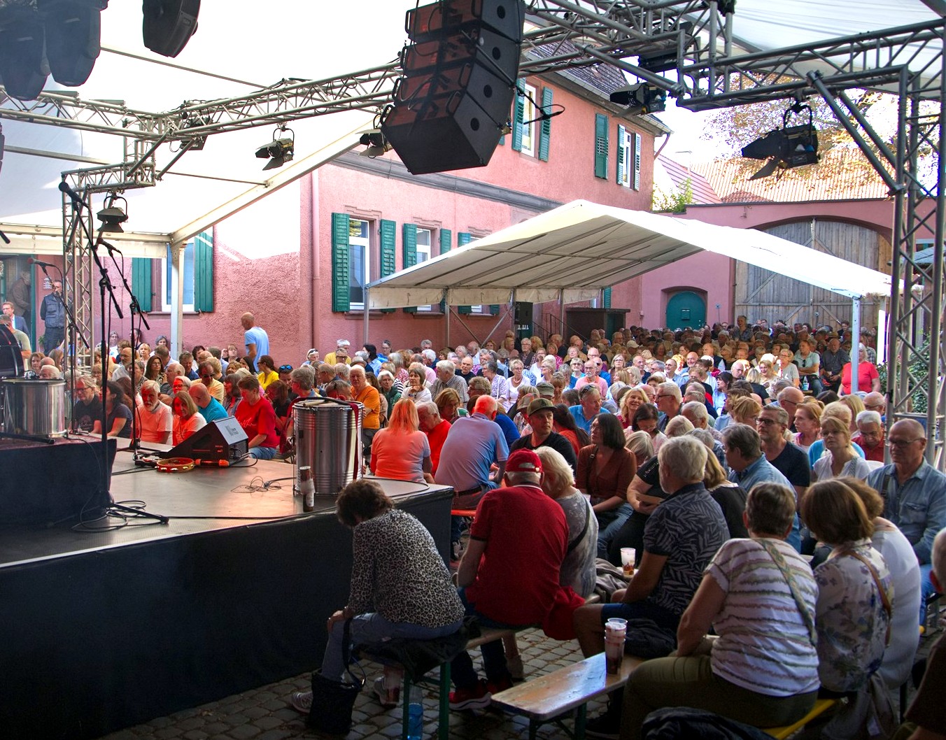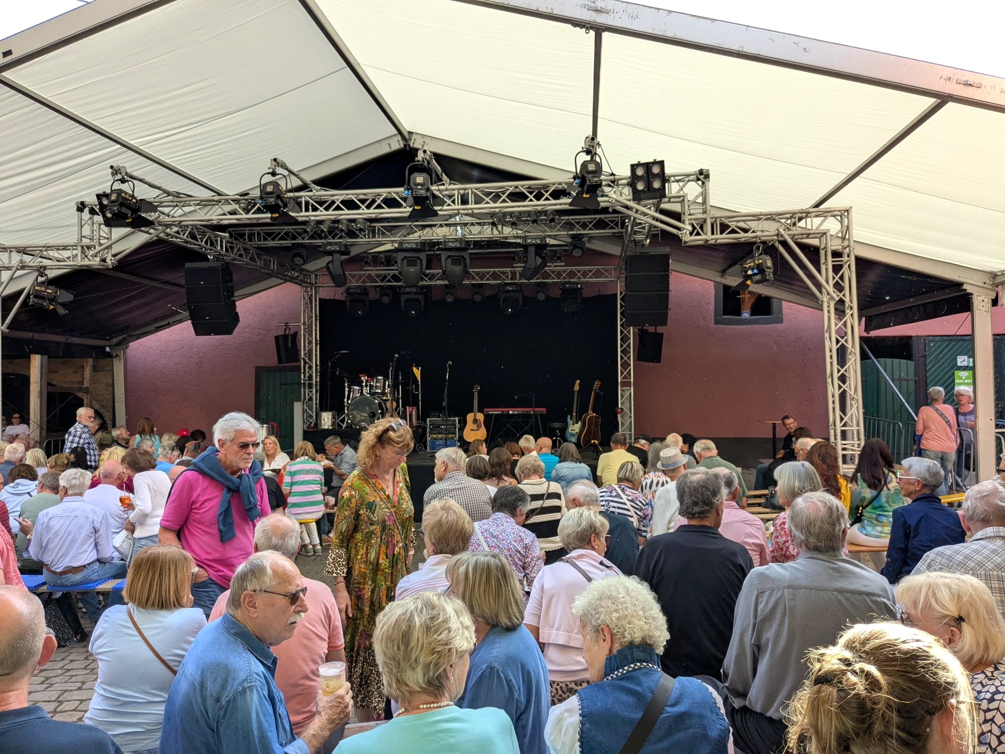 Mit dem Busunternehmen „Hettler“ aus Eppingen-Adelshofen und mit einem gut gelaunten Busfahrer ging es dann los in Richtung Dexheim – ein charmantes Weindorf, das uns mit seinem idyllischen Flair sofort gefiel. Dort angekommen, erwartete uns unter dem Motto „Kultur im Hof“ eine liebevoll gestaltete Kleinkunstbühne im Innenhof des Hofguts. Dank Veranstalter Wolfgang Weyell fand jeder seinen Platz – und wer lieber stehen wollte, wie jeder halt wollte.